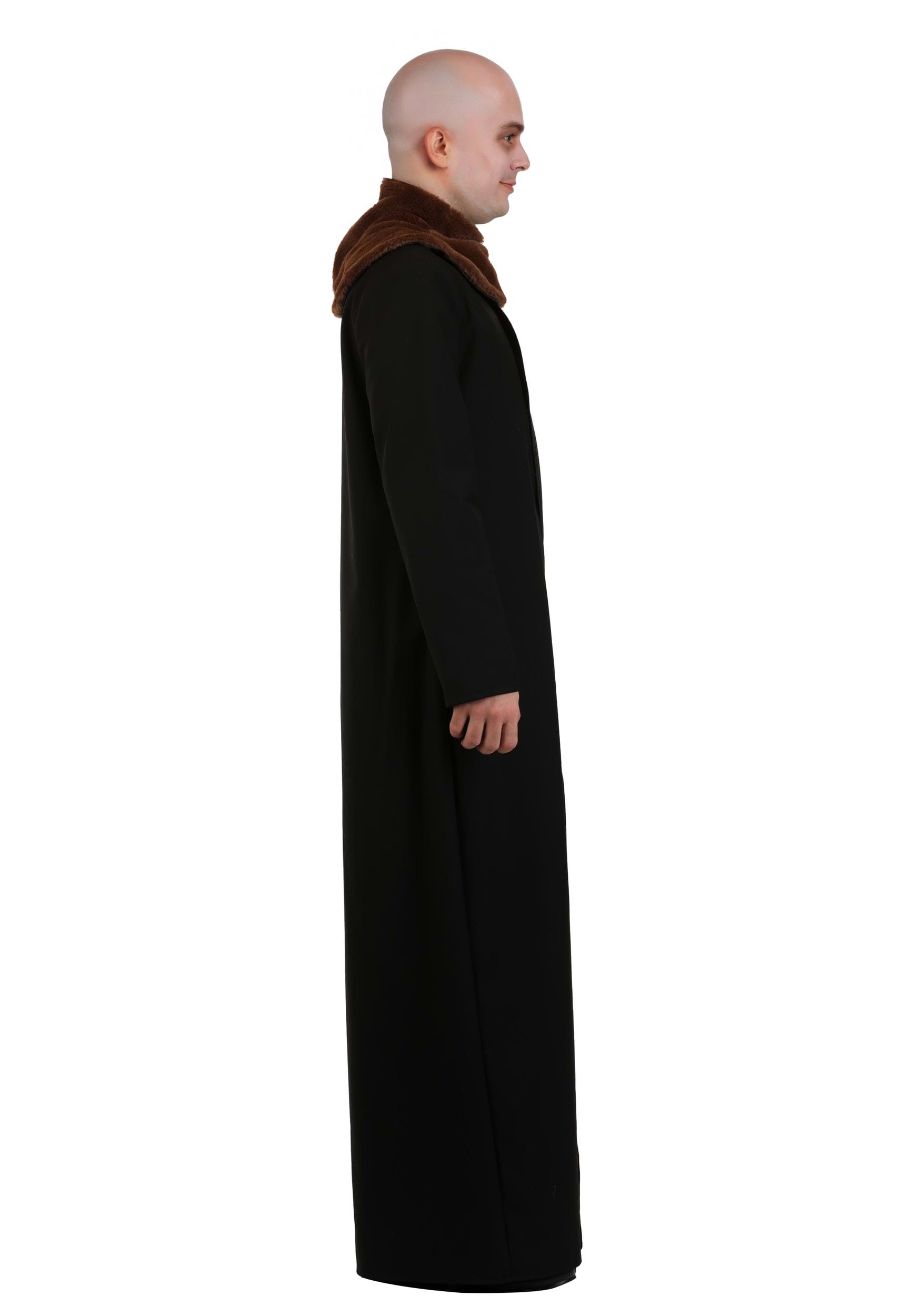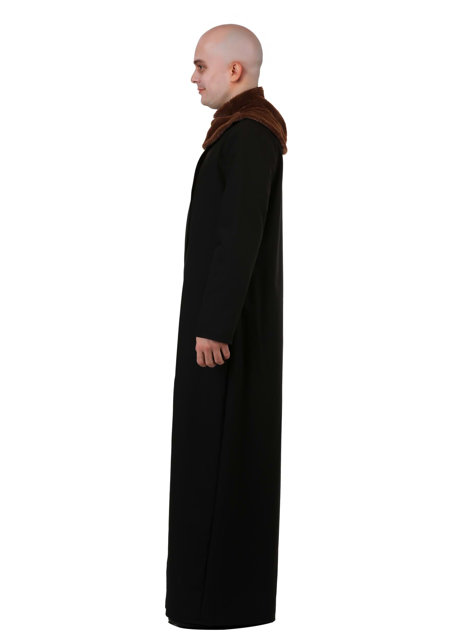 The costume includes a long black coat and a light-up bulb prop. The coat is made of a medium-weight poly woven fabric and features a wide collar made from medium pile faux fur, capturing the exact look from the original television series. The coat’s simple, straight-cut design gives it that unmistakable “cuddly crypt-dweller” vibe while still allowing for easy movement—useful for sudden, dramatic entrances or surprise electrical displays.
