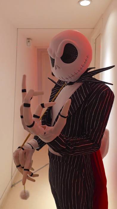 A foam-padded jawpiece moves with your mouth for added character, and the oversized gloves with interior finger controls animate Jack Skellington's long, skeletal hands. Topping it all off, the foam bat-shaped bow tie completes this unforgettable look.