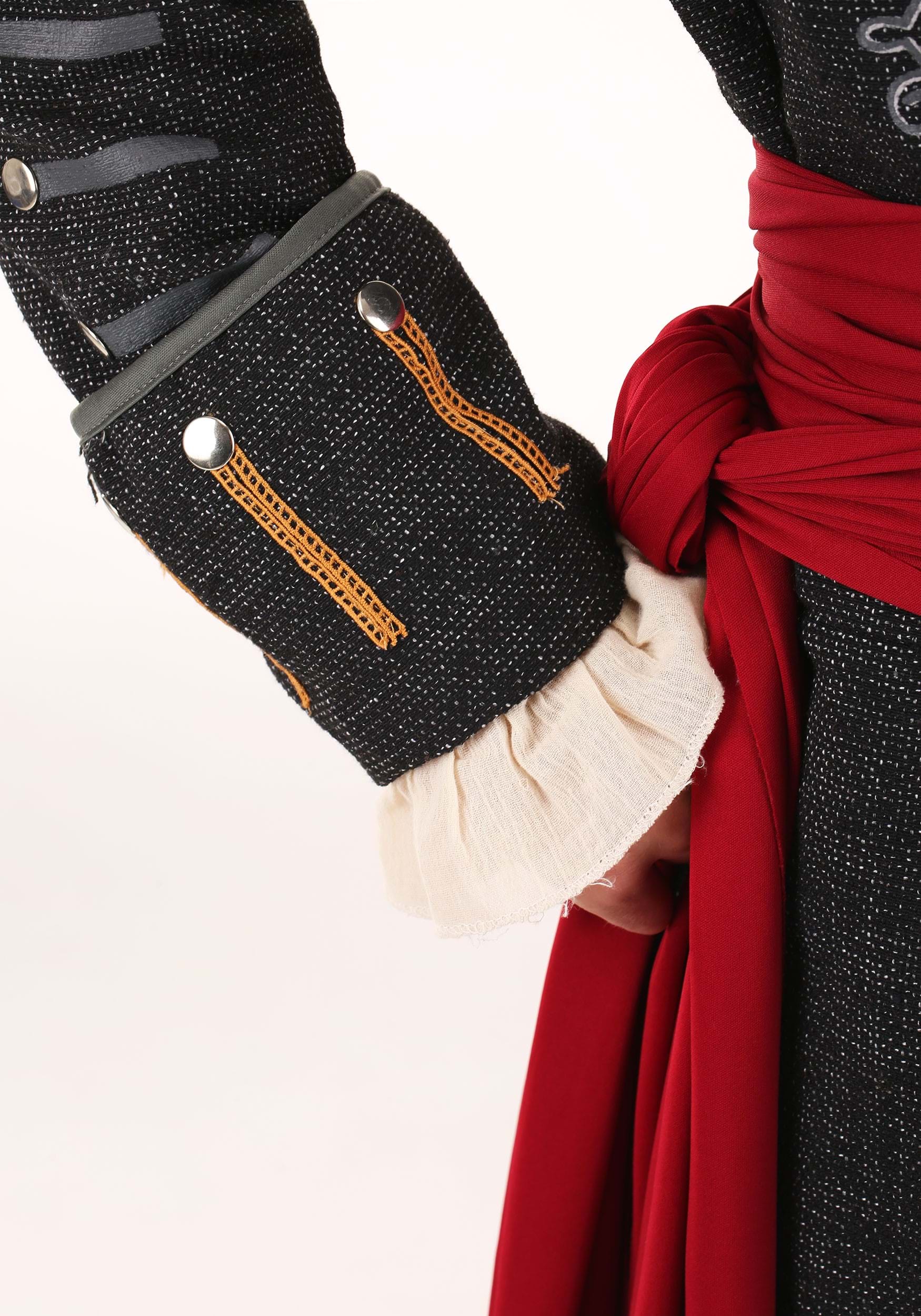 The woven jacket features screen printed details, and an attached false vest front truly emits the aura of a true captain, not like some of those other pirate costumes that make you look like some run of the mill cabin boy. The jabot adds an elegant touch, while the sash and cross belt add a touch of authenticity. The boot covers help turn a normal pair of shoes into buccaneer boots, while the hat puts the finishing touch on the look.