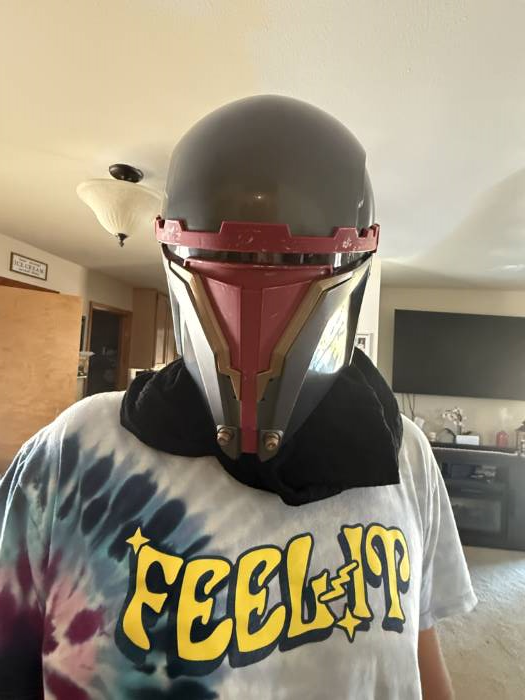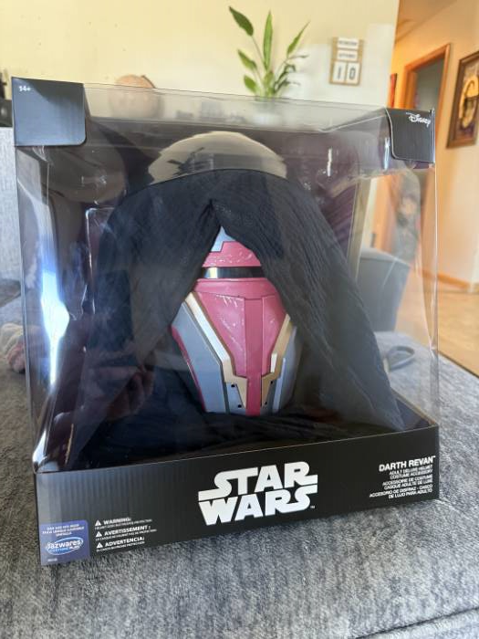 The helmet is molded from durable plastic and painted in bold, metallic shades of red, silver, and black—designed to match Darth Revan’s iconic look from the Star Wars: Knights of the Old Republic series. The sculpted lines and layered design give it a screen-worthy finish, with mesh over the eyes for limited but dramatic vision.