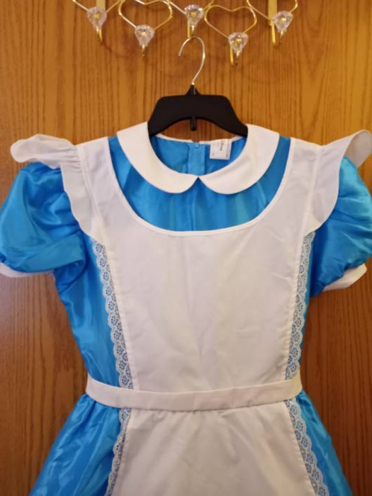 The light blue satin dress has a smooth, elegant finish, and the attached white apron ties with a soft ribbon in the back for a polished touch. A small white collar adds a prim detail that perfectly captures Alice's timeless style. The costume is topped off with Alice's black headband, complete with a neatly tied bow.