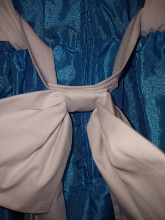 The blue fabric is a stiff, shiny, taffeta - not thin or cheap. (The taffeta isn't iridescent as the description indicates. There isn't any rainbow prisms - I was relieved about that!) The white fabric for the apron seems like a sturdy polyester. The apron in top front is secured to the dress and the right and left sides of the bow in the back is already formed and stitched to the waistline of the dress. Just zip up and velcro the bow. No need to tie the bow! This dress was thoughtfully designed. Medium fits 34C perfectly.