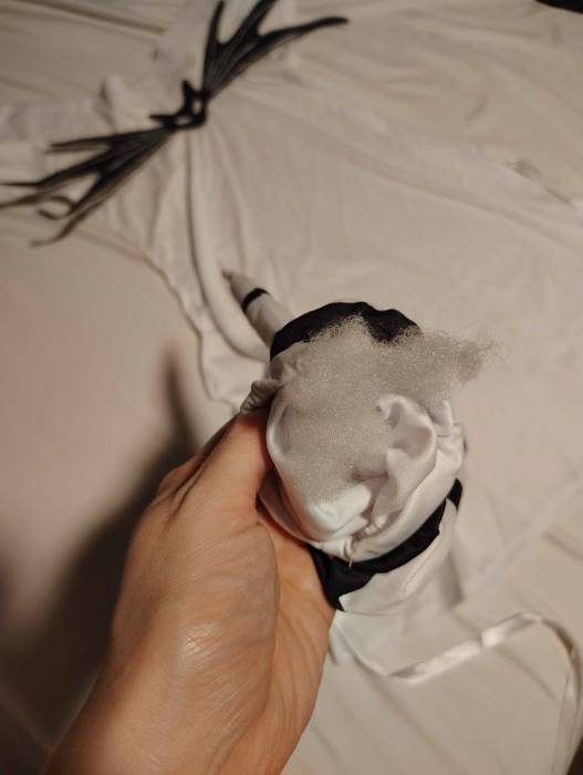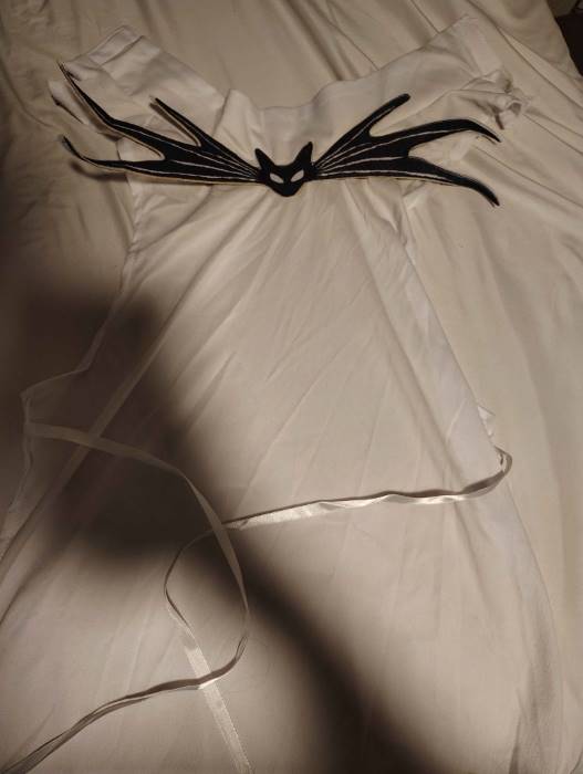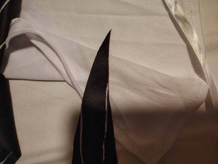 When the costume says "shirt front" it really just means a bib with ribbon and a pretty cheaply made bowtie on the front. There are threads sticking out EVERYWHERE and the sewing work is terrible. The way they make the fingers on the gloves is just by stuffing cotton into it which is not at all secure so every time you take your hands out there's just cotton falling everywhere.