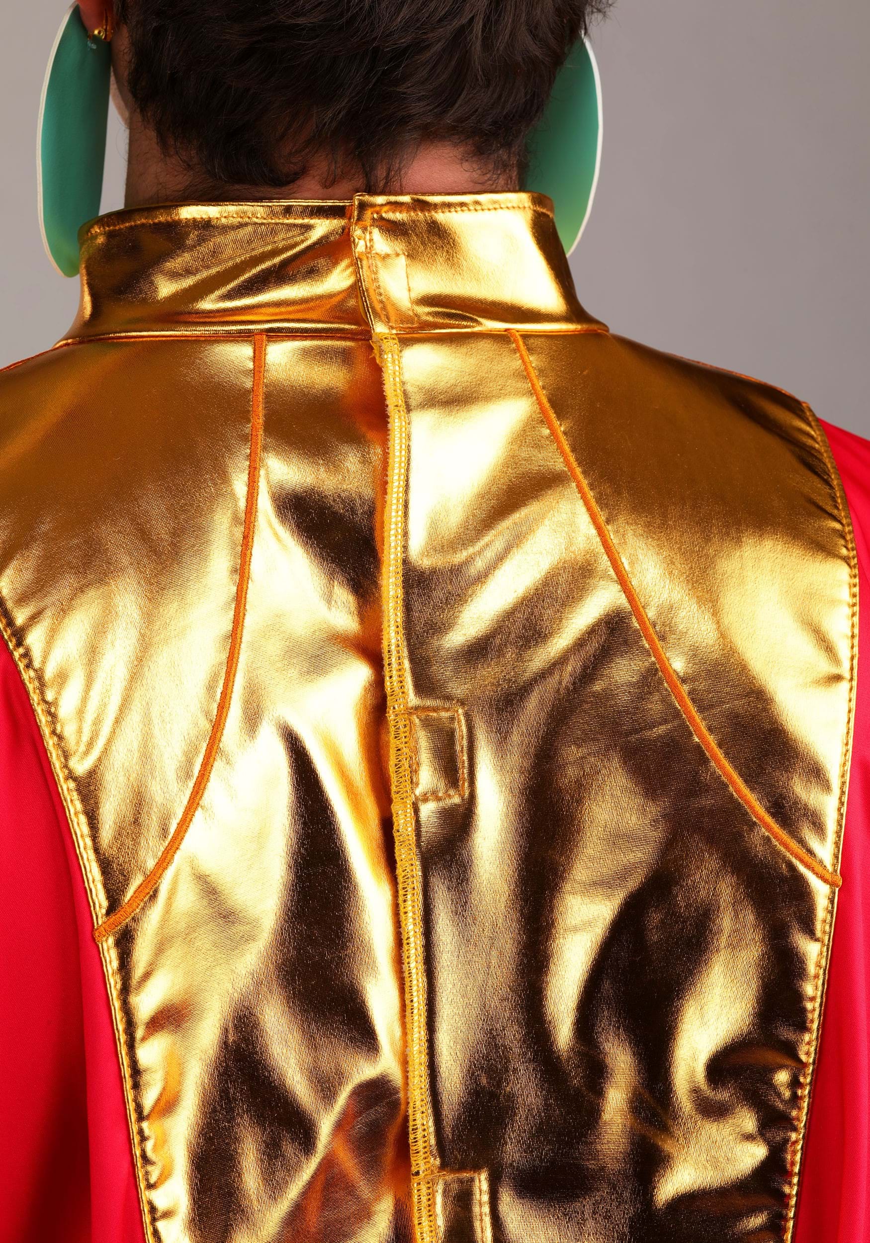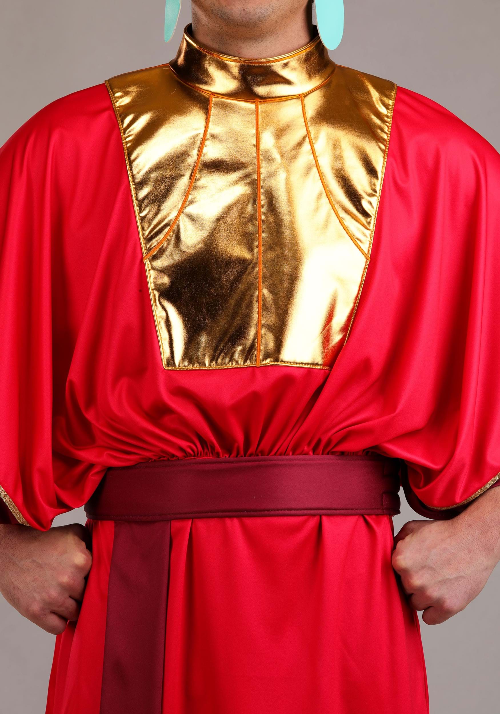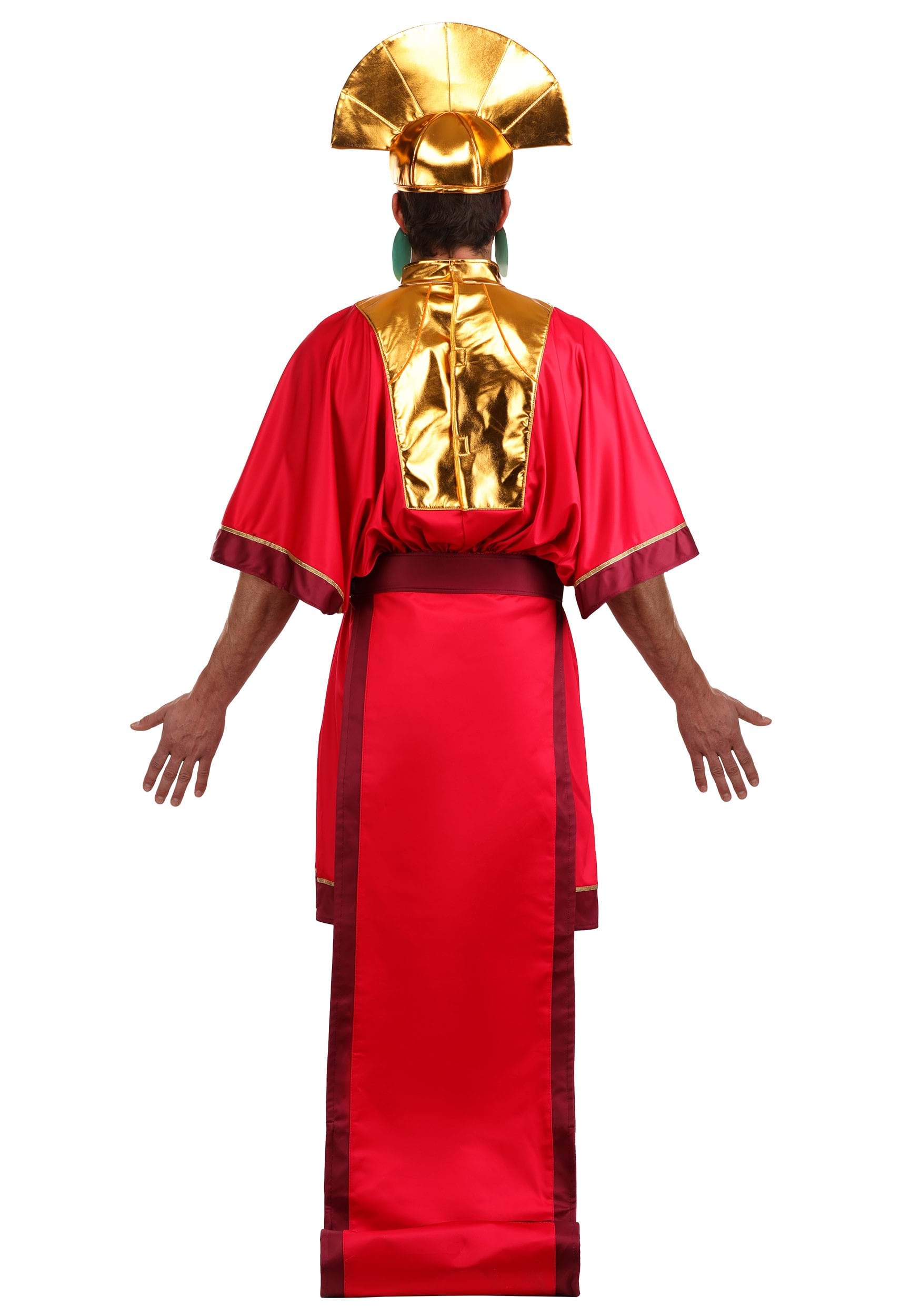 This ensemble channels Kuzco's extravagance with a rose-red jersey tunic trimmed in purple and gleaming gold. The attached golden collar frames the neckline while a sculpted wireframe train curves behind in true imperial flair. The tunic fastens easily in the back, as does the shimmering belt tipped in metallic gold. A sculpted gold headpiece with elastic edge and foam-backed crest crowns the look, while matching gold cuffs complete this over-the-top look.