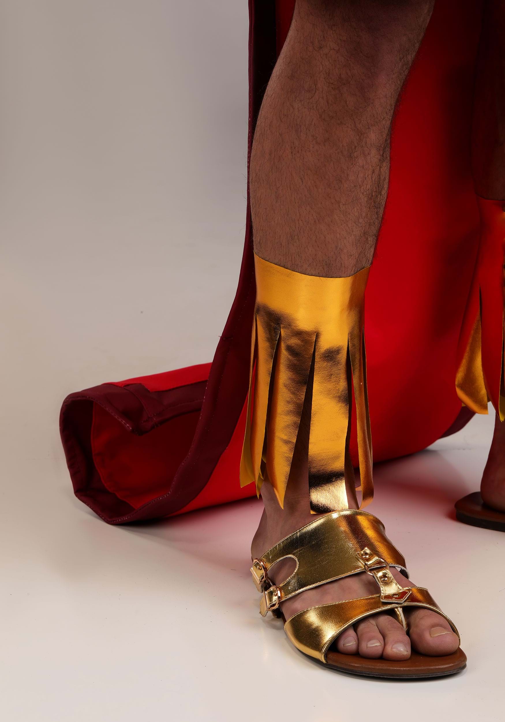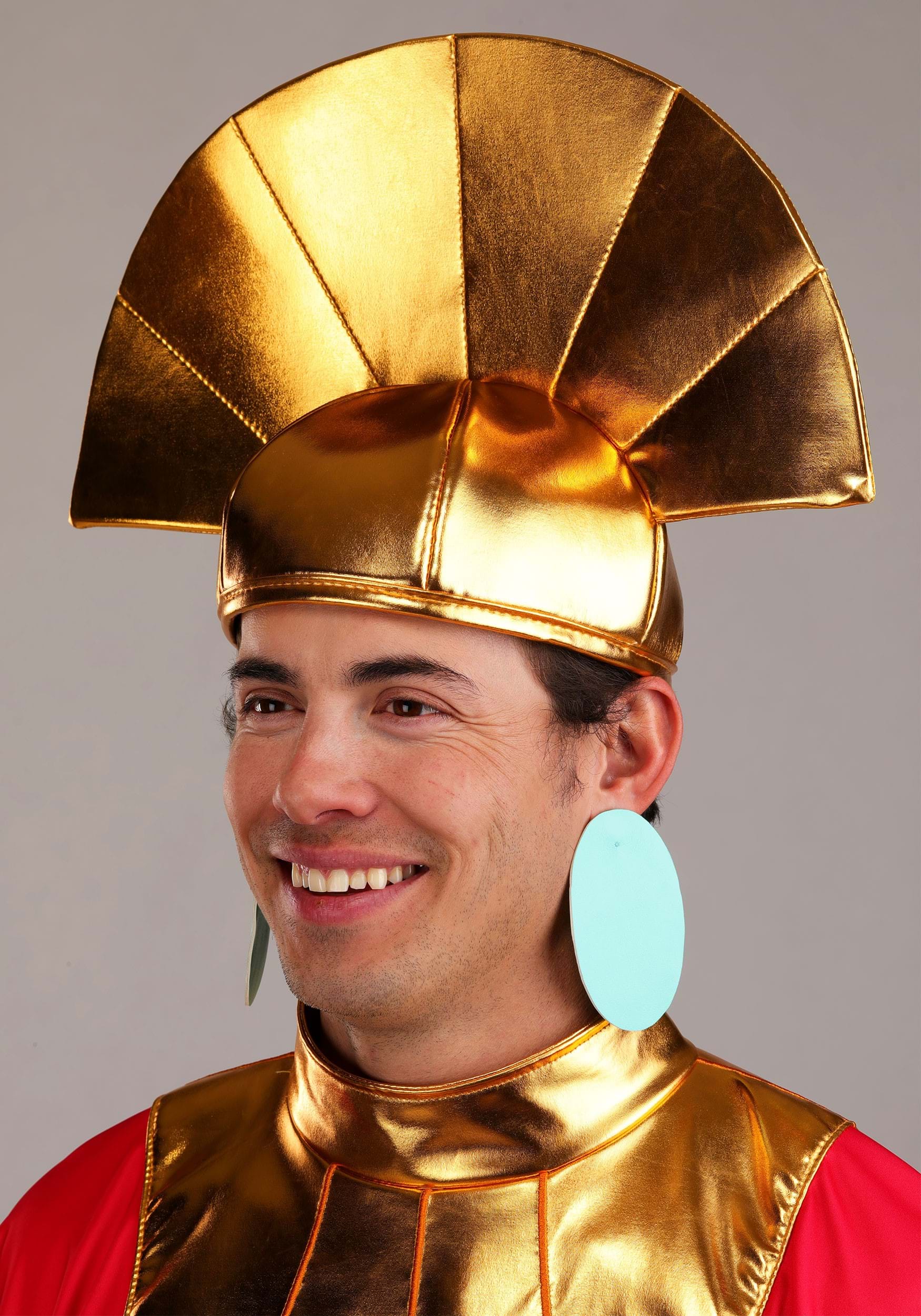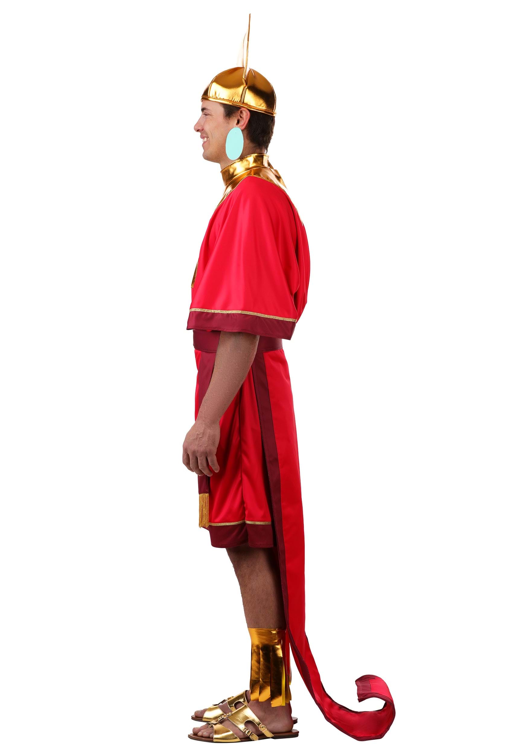 This ensemble channels Kuzco's extravagance with a rose-red jersey tunic trimmed in purple and gleaming gold. The attached golden collar frames the neckline while a sculpted wireframe train curves behind in true imperial flair. The tunic fastens easily in the back, as does the shimmering belt tipped in metallic gold. A sculpted gold headpiece with elastic edge and foam-backed crest crowns the look, while matching gold cuffs complete this over-the-top look.