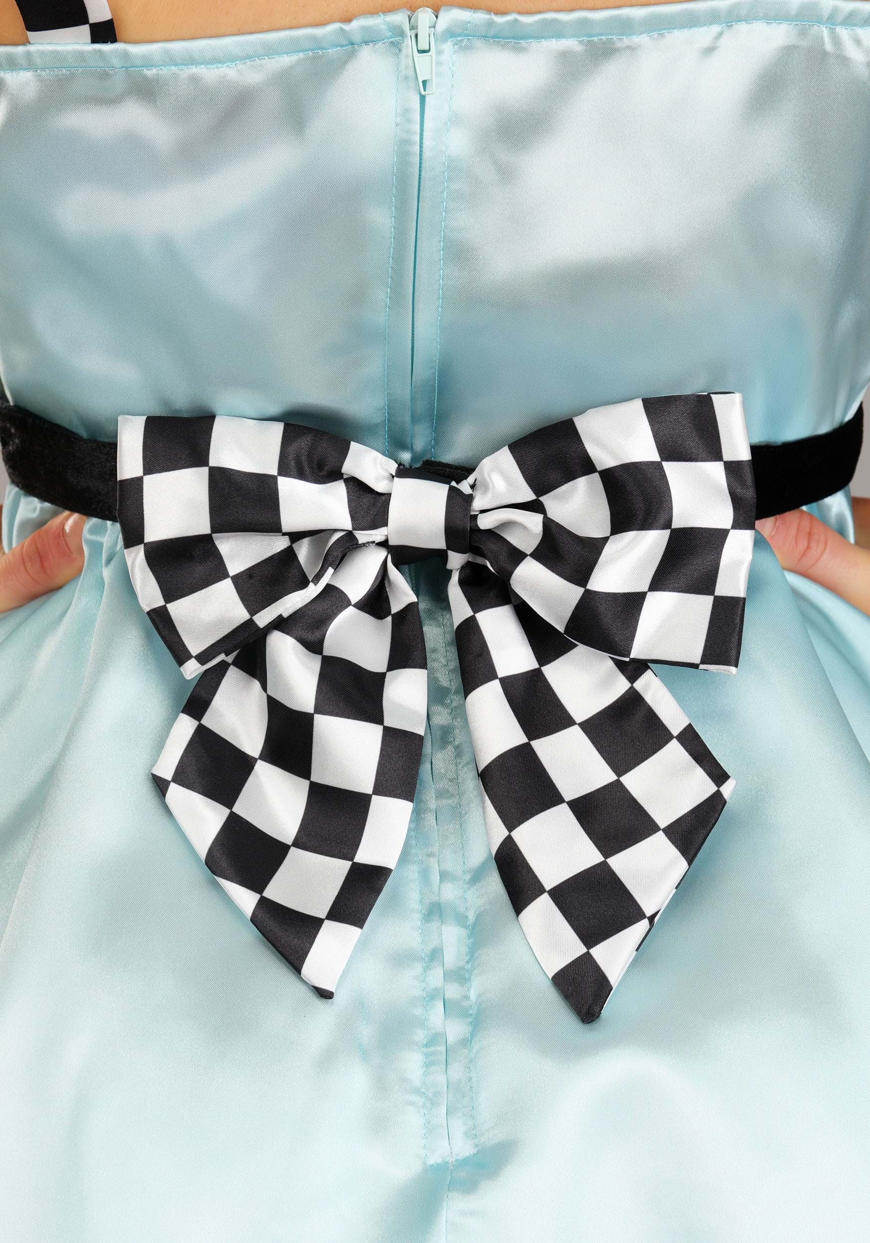 This three-piece costume set includes a dress, headband, and stockings. The dress is made from heavyweight satin with a soft blue sheen and a fitted bodice accented by a black bow on the bust. The skirt features a bold black-and-white diamond check trim around the hem for a Wonderland-worthy flair. Attached to the front is a white apron printed with red card suits and two card soldiers standing at attention.