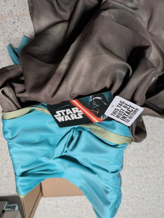 This Leia costume features a woven hooded poncho with a printed woodland camo pattern. The light blue leggings are made of stretch knit jersey fabric, with light green side stripes to recreate the movie look. You'll be dressed for adventure, whether that means fighting off the Empire or just winning best-dressed at your next fan event.