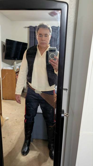 The adult Han costume comes with everything you need to pull off Han's classic "galactic rogue with a heart of gold" look. The cream-colored shirt has a deep V-neck and a linen blend that nods to the worn-in comfort of a guy who spends more time in hyperspace than in laundry cycles. Layered over it is the black vest, complete with textured detailing and actual working pockets, ideal for stashing credits, comlinks, or something vaguely smuggled.