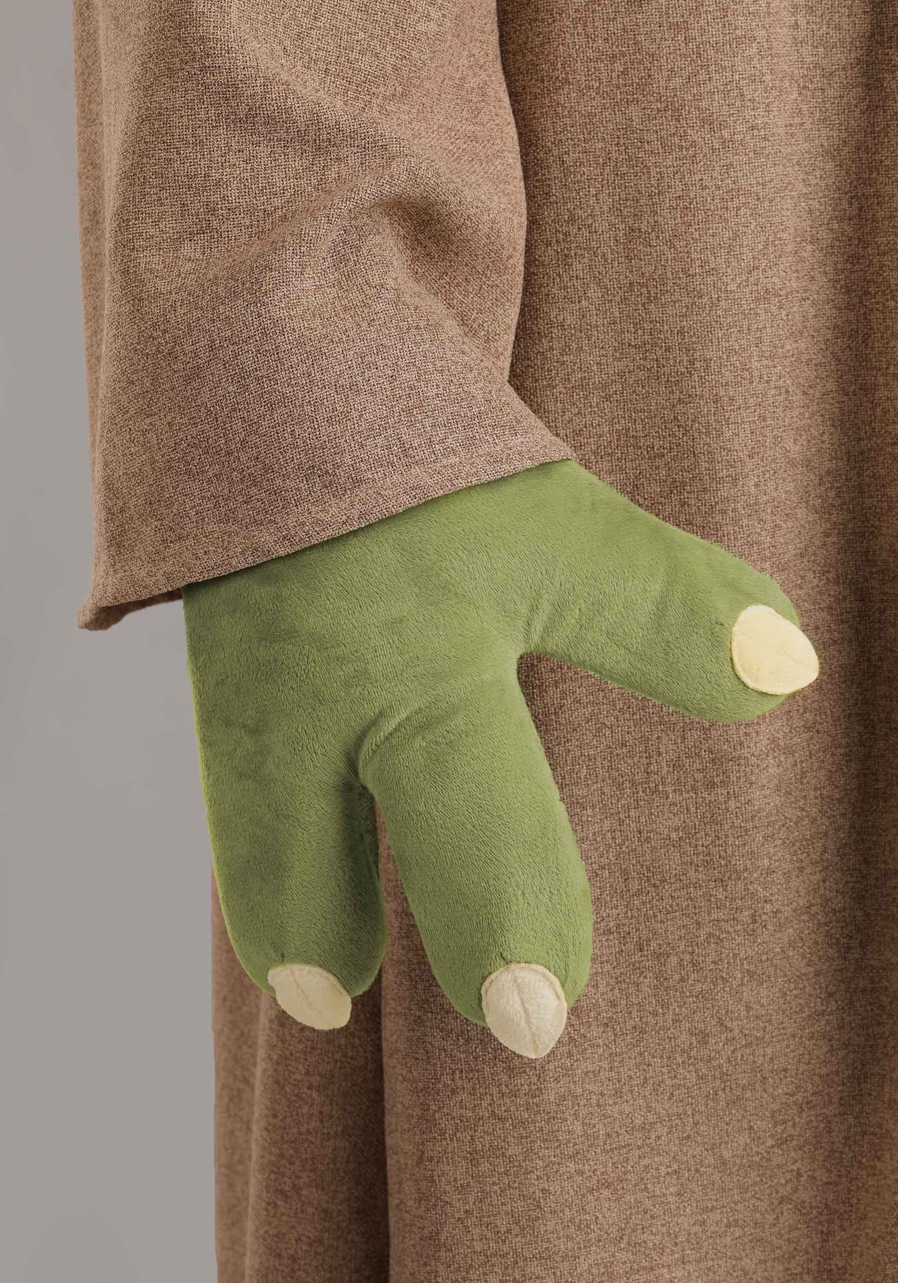 To complete your transformation, the green stretch cowl secures with hook and loop tape and blends seamlessly with the foam half-mask, which has mesh eye holes providing visibility without breaking your disguise. The three-fingered gloves have foam backing for shape and Minky nails for that weirdly adorable touch. Jedi business never looked this plush.