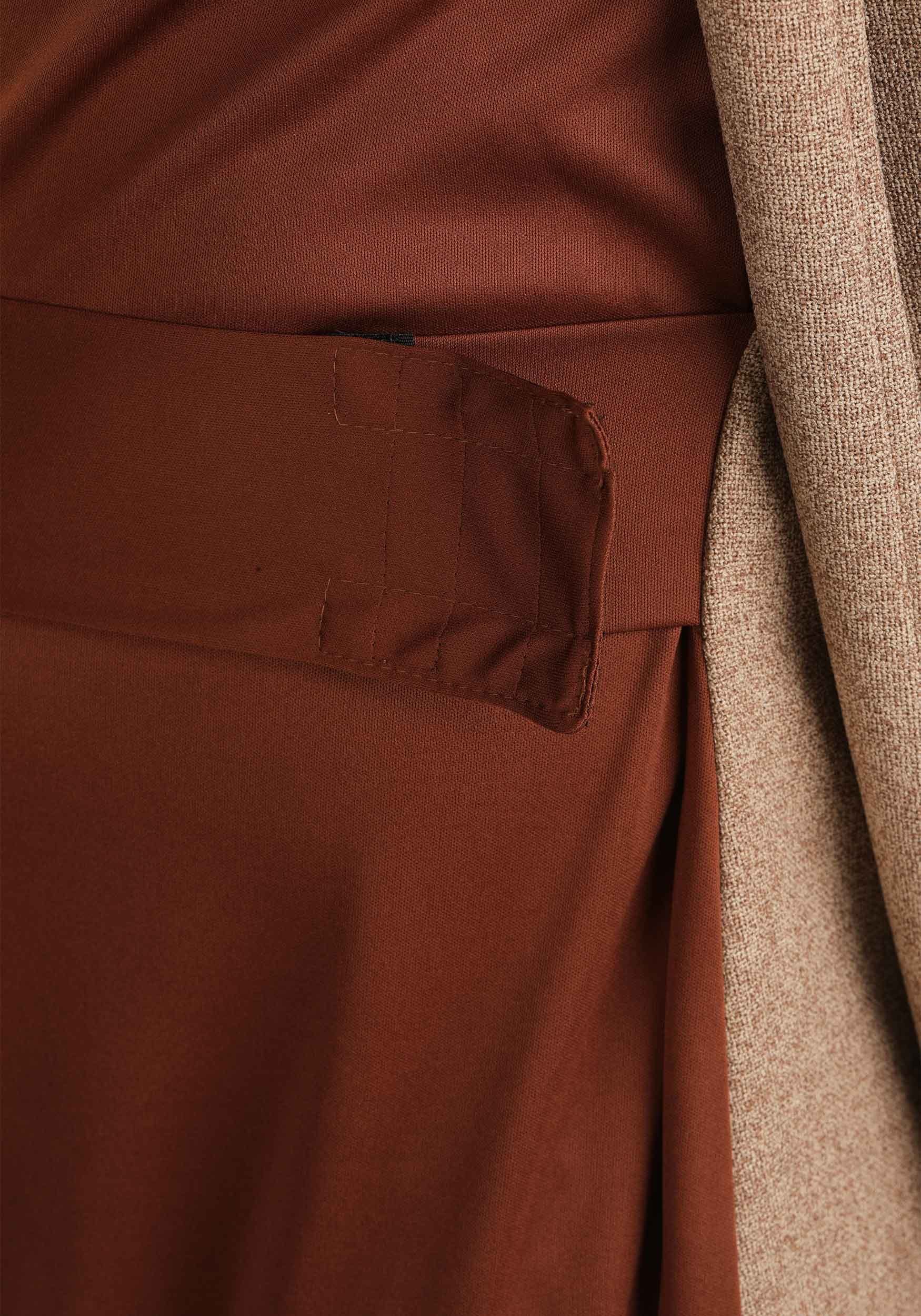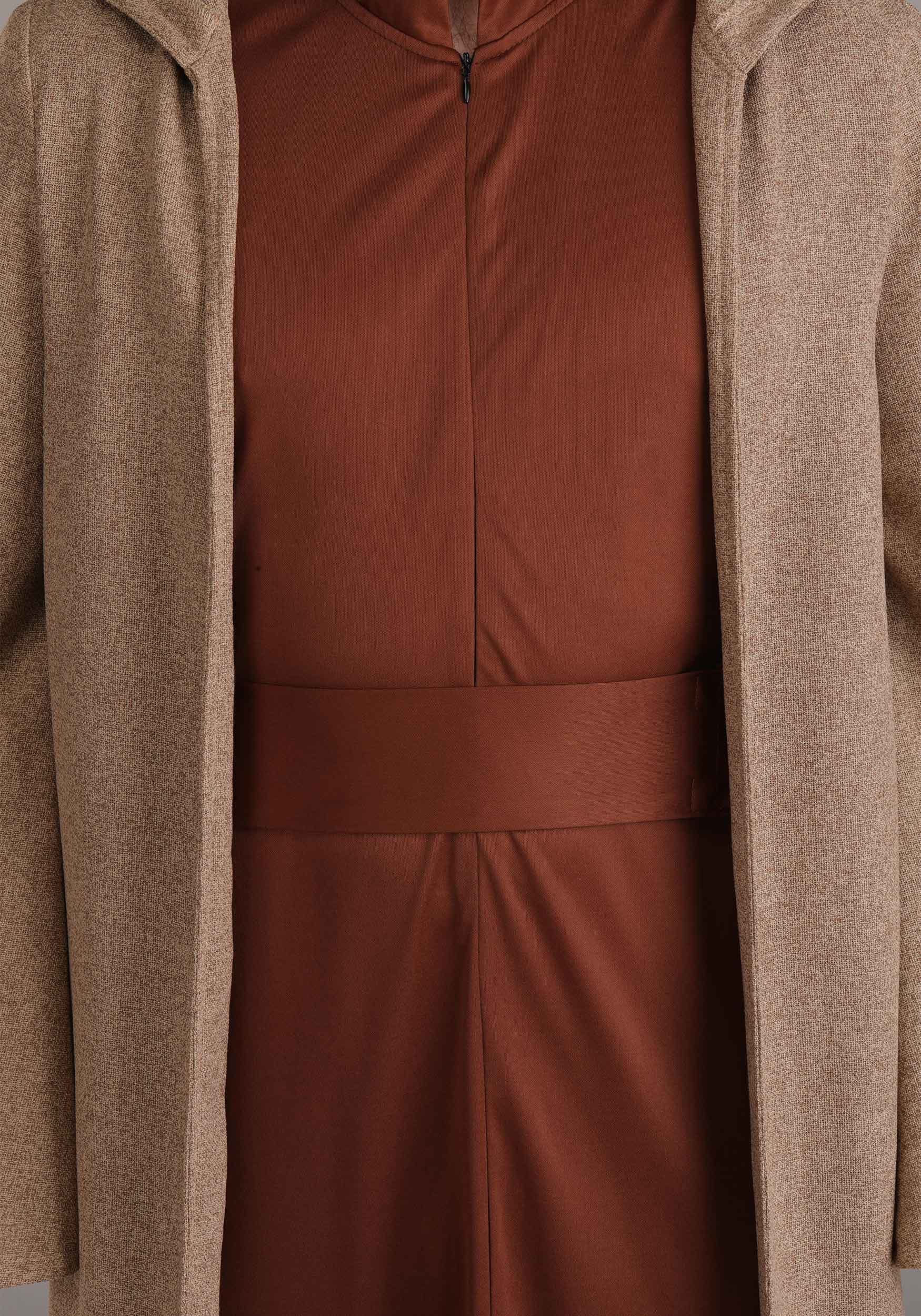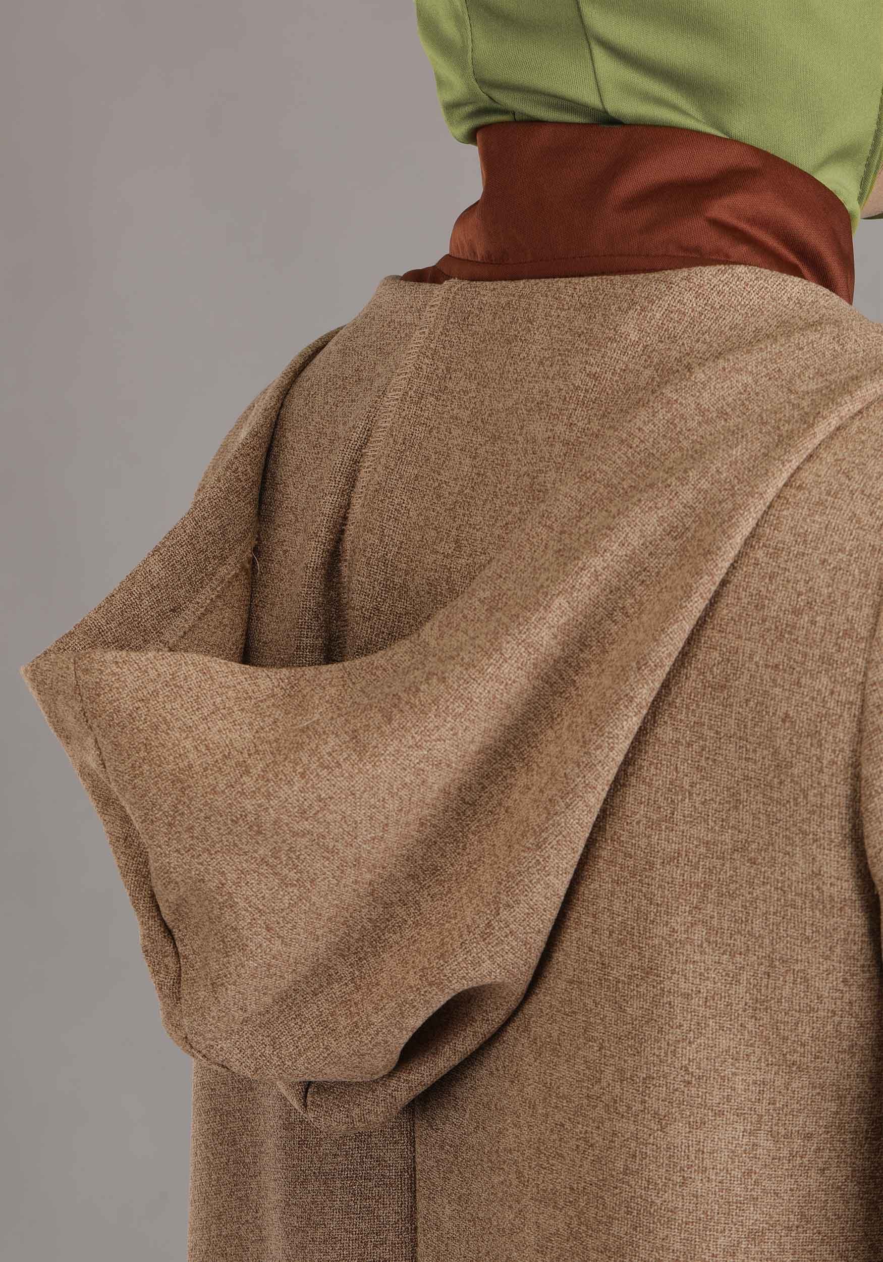 The robe features a dark brown jersey underlayer and a tan woven outer layer for that authentic Jedi Master look. Wide sleeves give it dramatic flair for gesturing wisely, and the sewn-on sash and oversized hood bring the gravitas. It zips in the front with an invisible zipper, because who wants a Jedi Master with wardrobe malfunctions.
