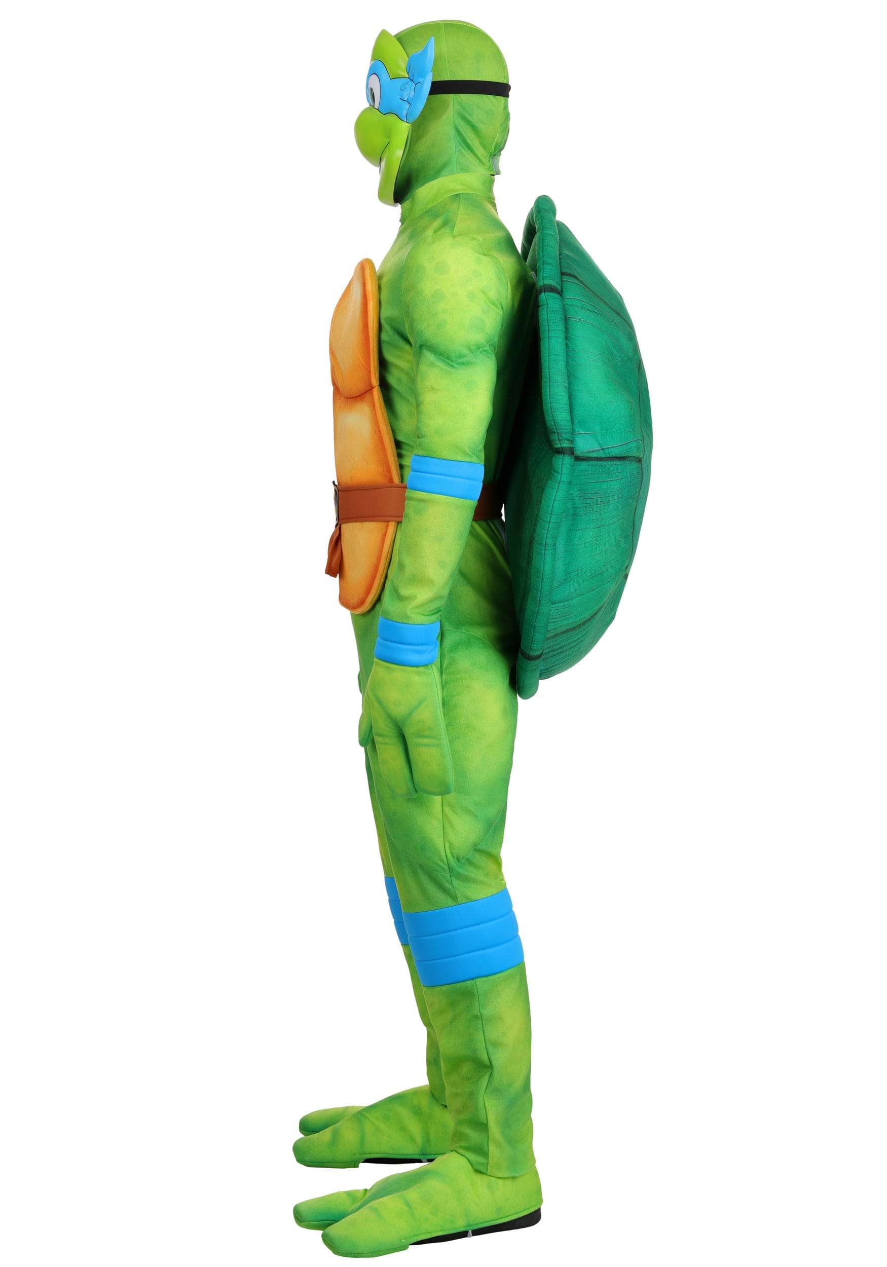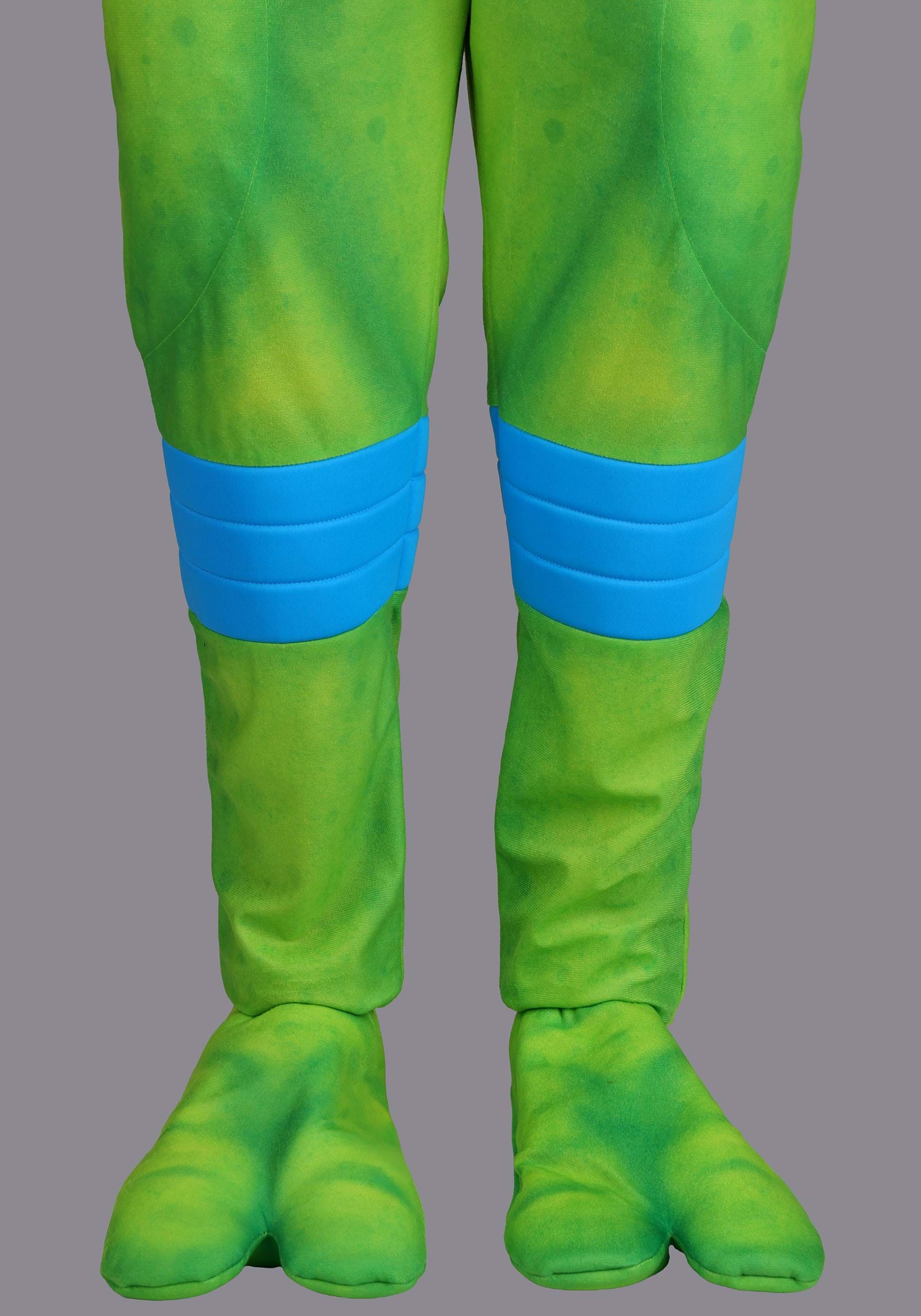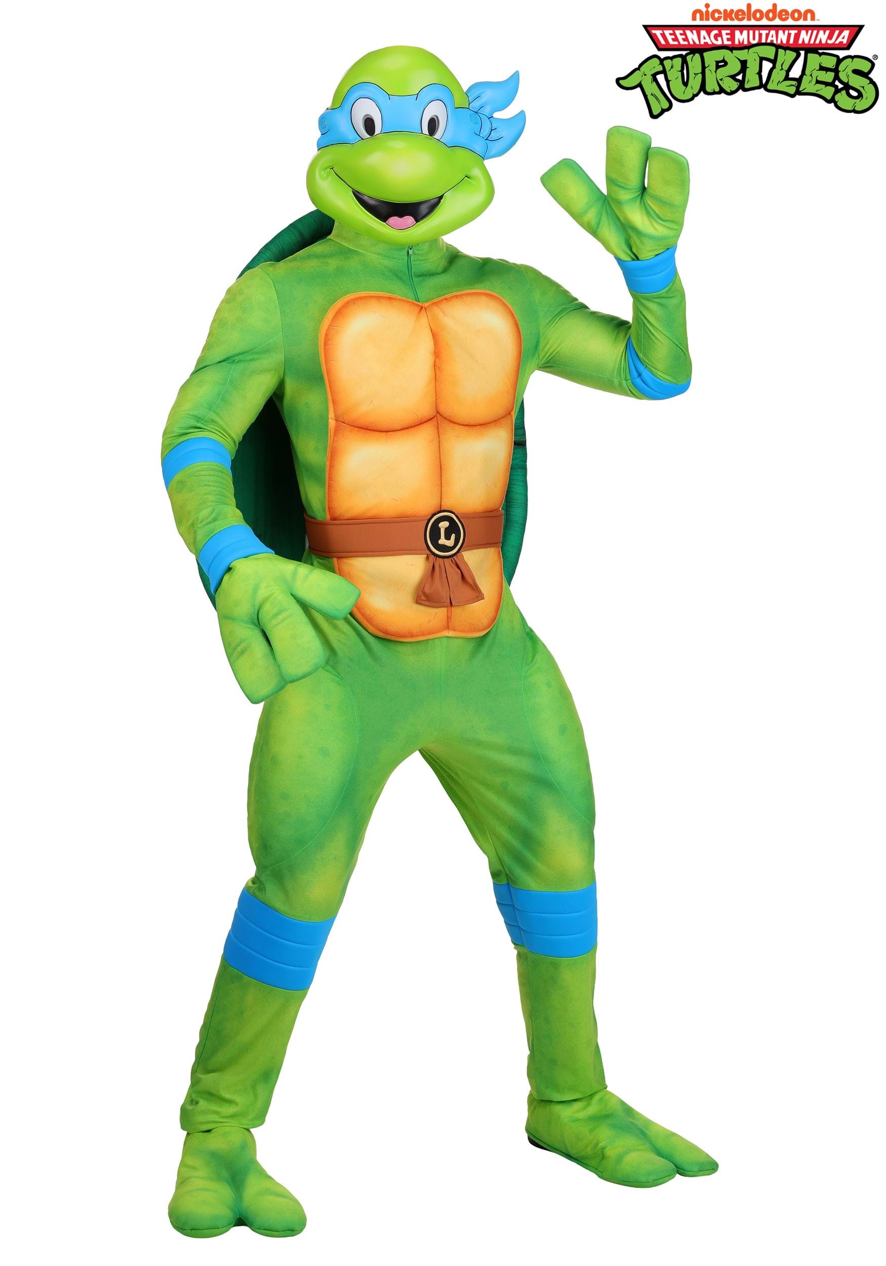 This officially licensed costume includes a green minky jumpsuit with printed detailing and a back zipper, a molded foam full-face mask with hood and mesh eye openings for visibility, plus a simple blue cloth eye mask if you prefer a more low-key look. The brown belt is jersey material with an embroidered "L" medallion and hook-and-loop closure. Gloves and foot covers round out the full turtle silhouette.