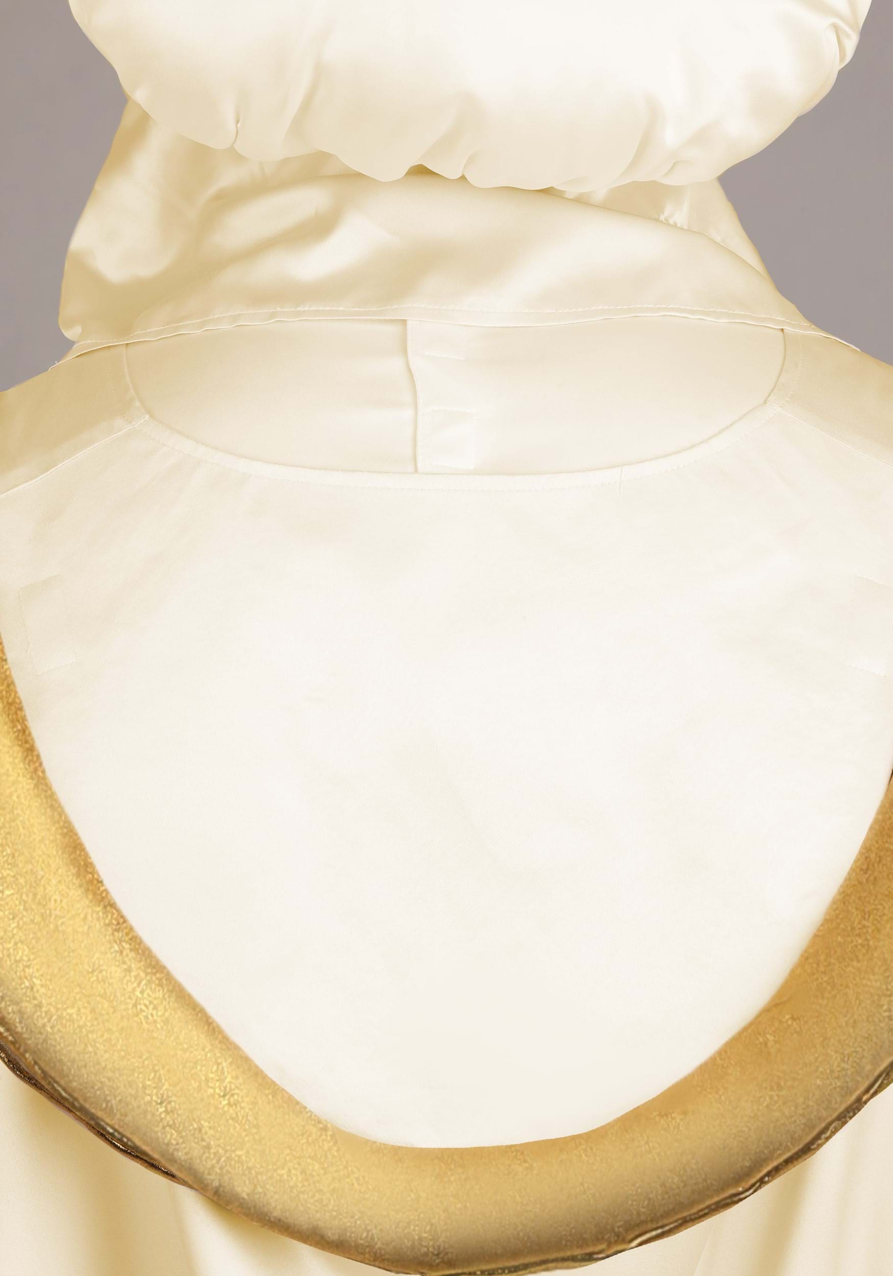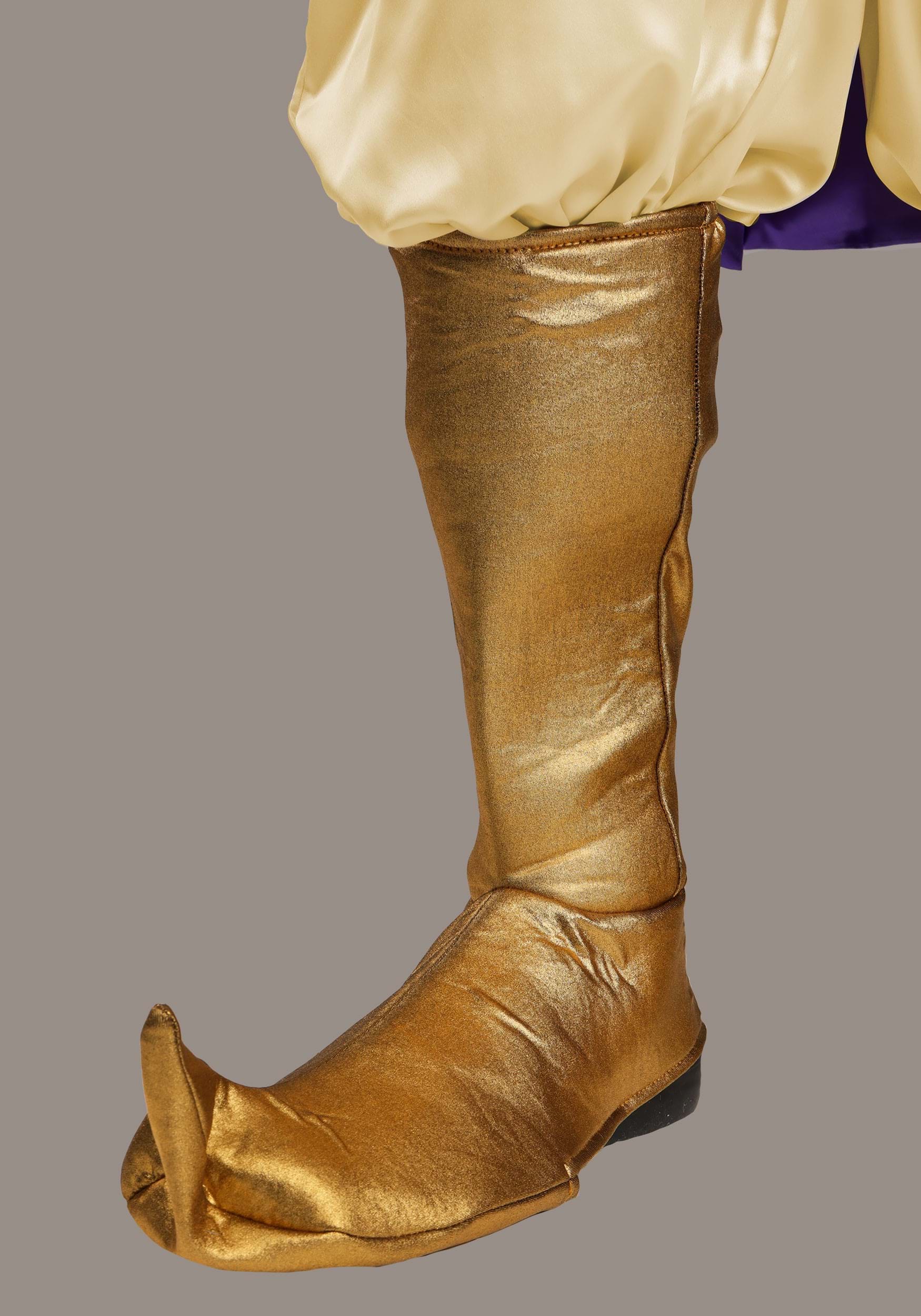 The cream-colored shirt and matching pants feature gold detailing, with an elastic waistband for easy movement. The satin-lined cape adds a bold, royal touch, while the gold boot covers fit over most shoes for a polished look. Topping it all off, the turban features a gold band, a faux gemstone centerpiece, and a purple feather.