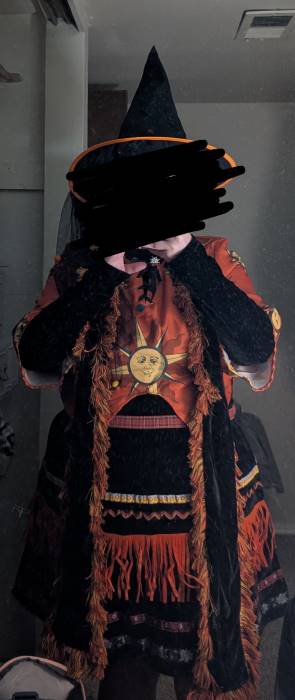 This Made By Us exclusive Halloween costume is inspired by Dani Dennison. This set includes a black long-sleeved dress with appliqued strips of colorful brocade ribbon. The orange bodice features a laced v-placket and pointed hemline, with printed sun and moon motifs. Complete your look with the black scarf with fringe edging all around and a classic black witch hat with a wide brim with orange edge binding, complemented by tulle and colorful pompoms.