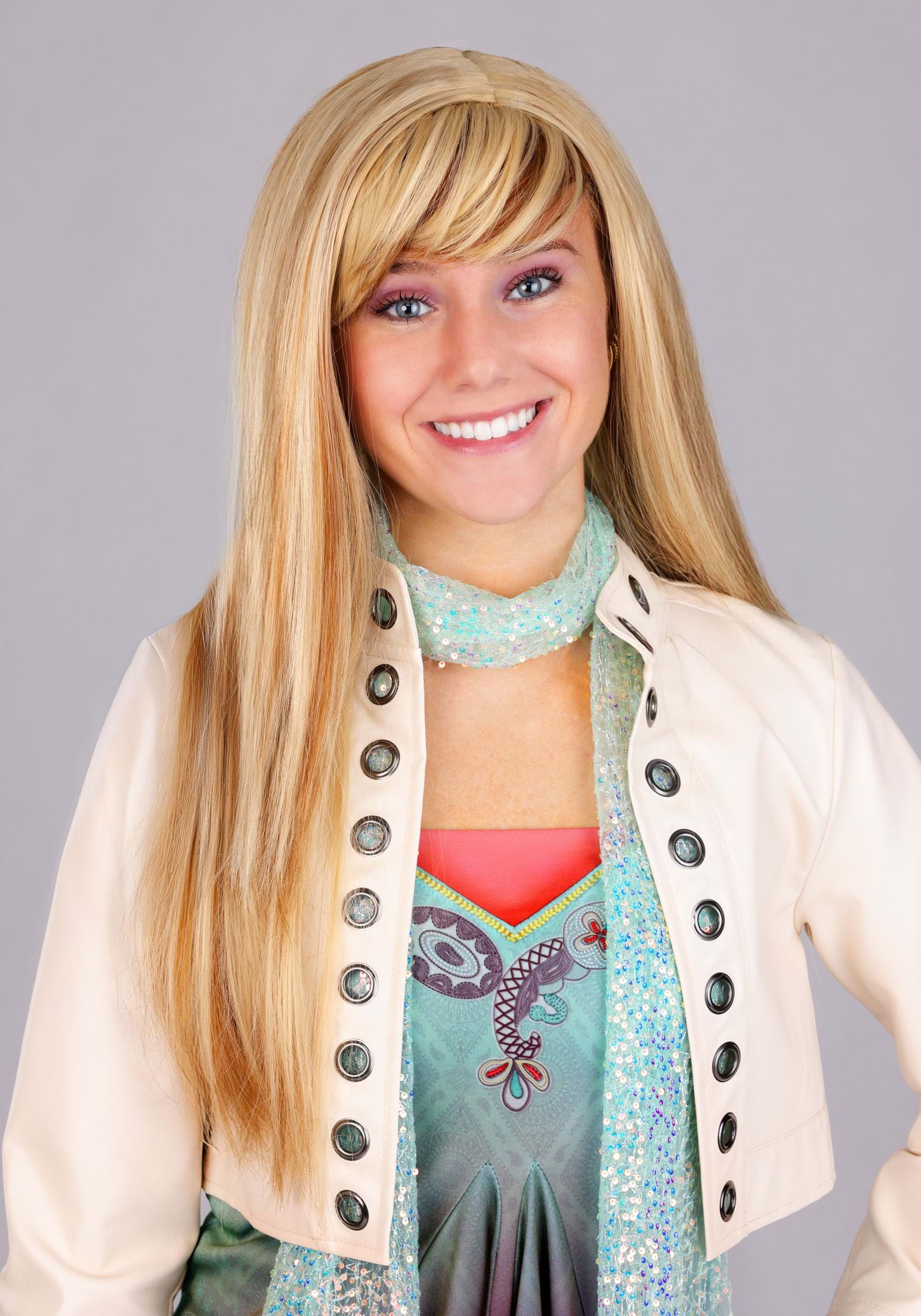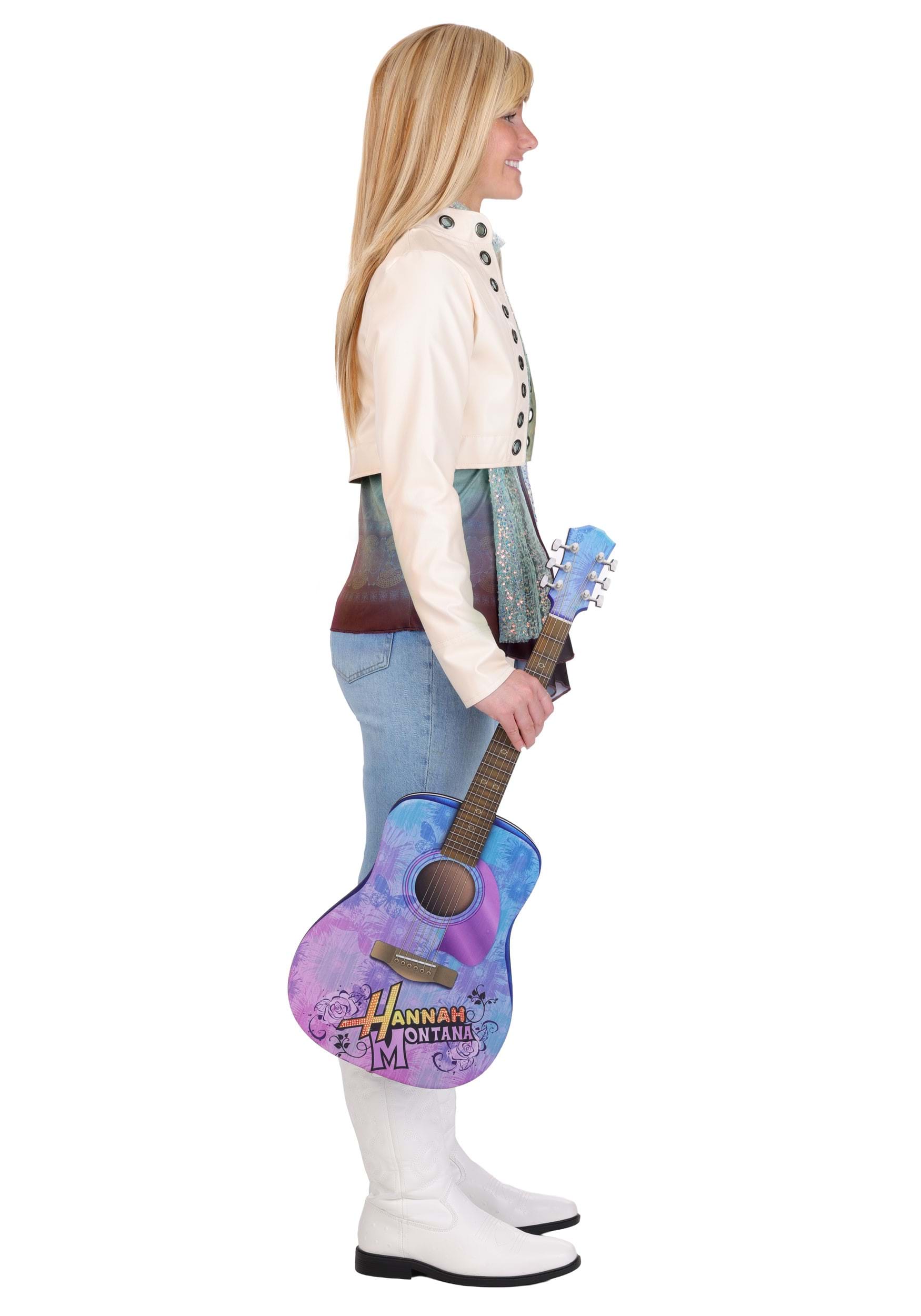 Go from every day to stage-ready with this officially licensed costume. It starts with a signature layered tank tops and a 2000s era faux leather jacket. Pair with your preferred bottoms for comfort and customization, so you can enjoy Hannah's flair and your own at the same time. Polish the look with a provided sequin scarf, adjustable long blonde wig, and foam-backed purple-printed guitar.