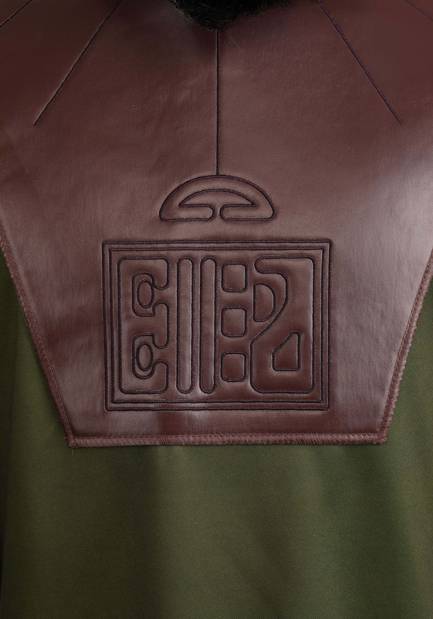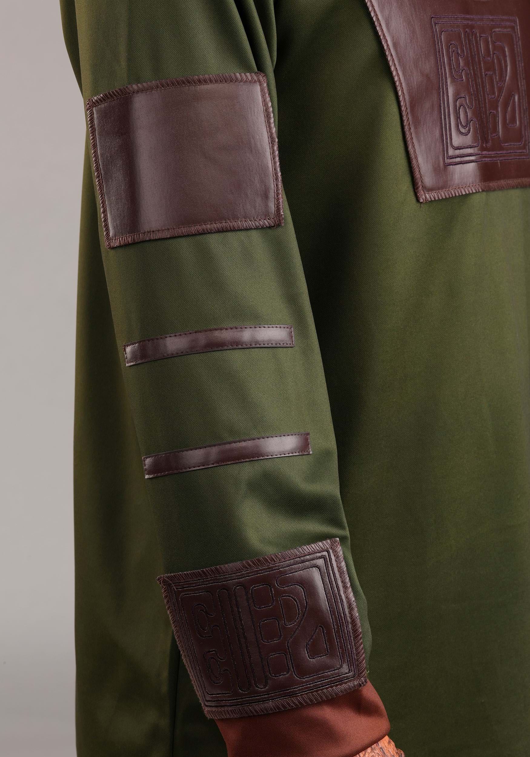 - Poly broadcloth shirt has hook and loop fastener on the back, foam backed, faux leather chest panel and sleeves details with quilted details