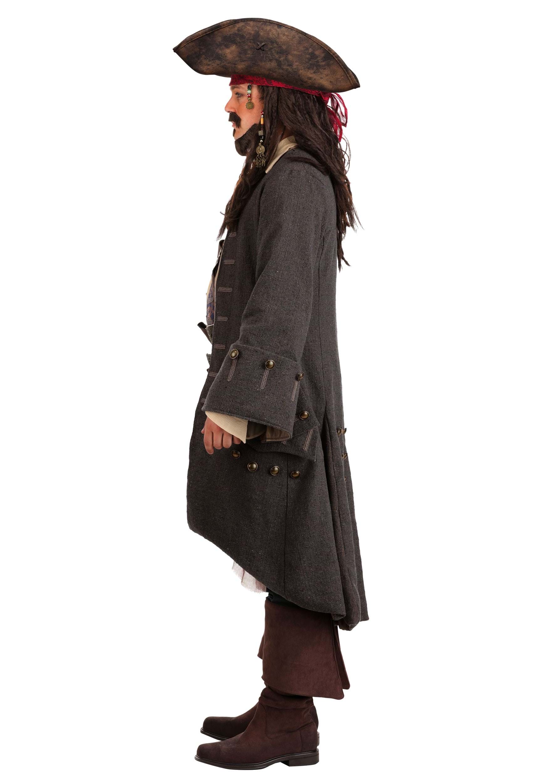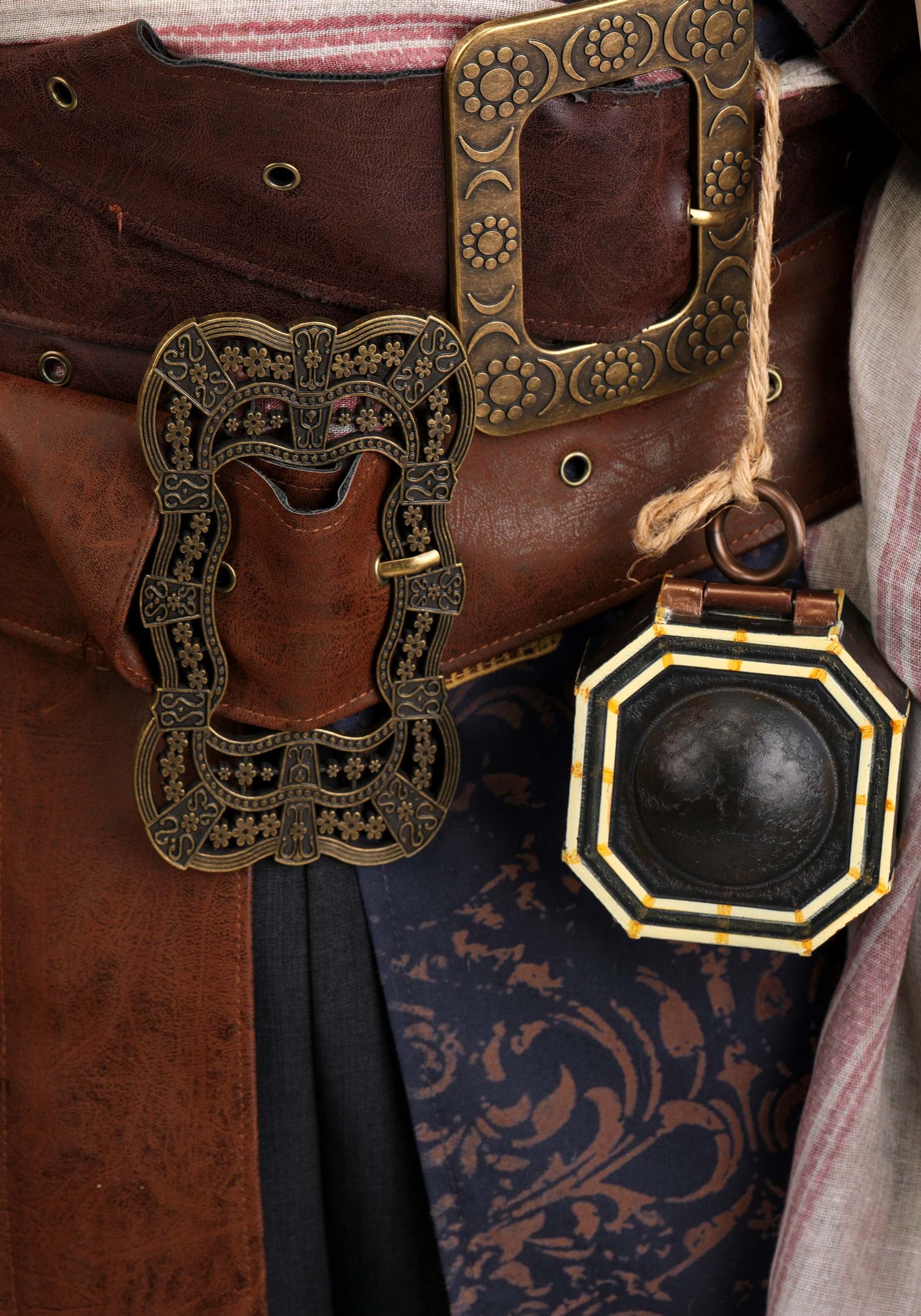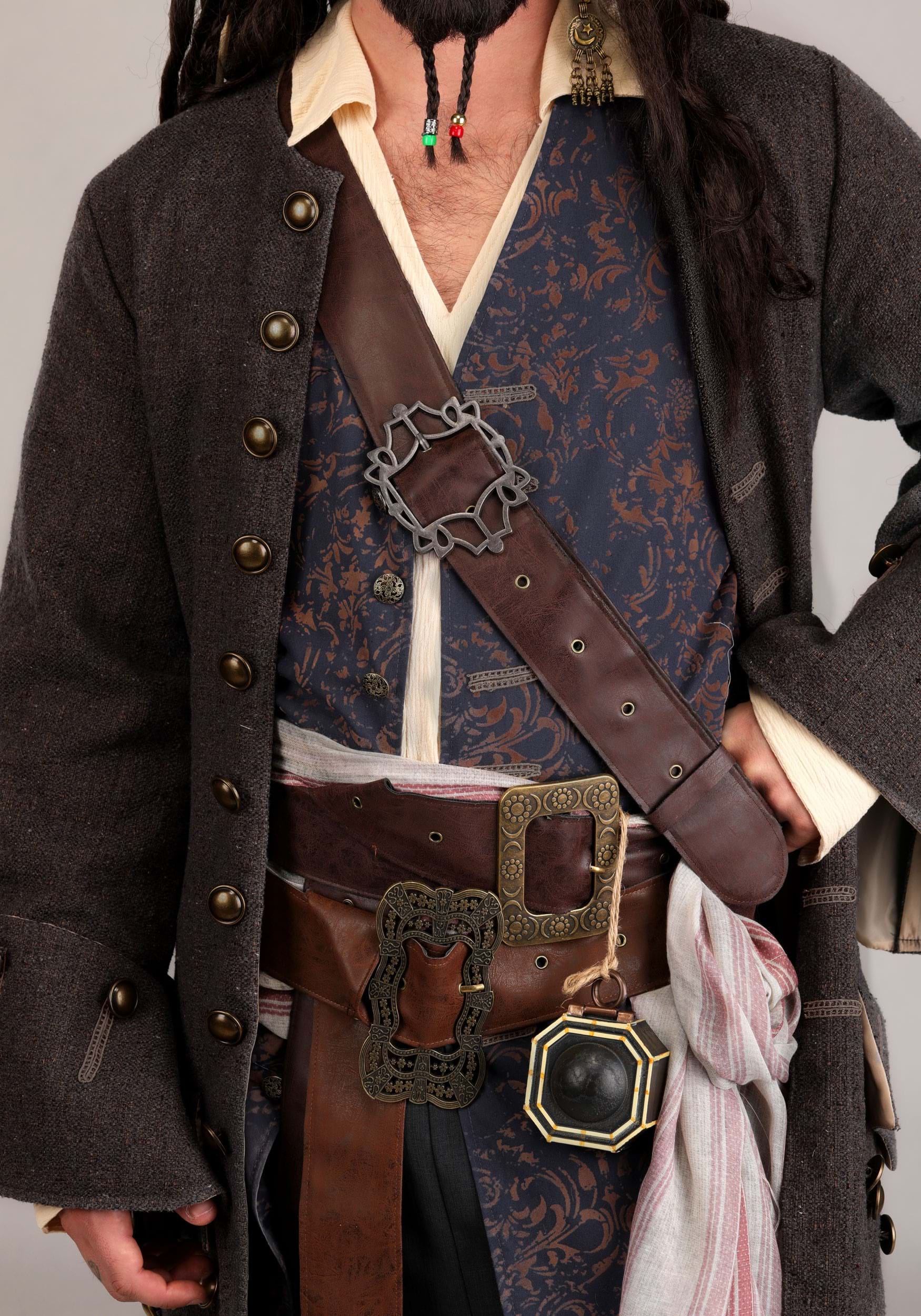 The linen-blend shirt boasts elastic cuffs for a comfortable fit, while the elastic-waist pants feature intricate embroidery and antiqued bronze buttons. A long, raw-edged sash is accompanied by four distinct faux leather belts with embossed patterns and unique buckles. Finish the look with the compass accessory and Jack's signature facial hair, including a mustache, patch, and braided beard.