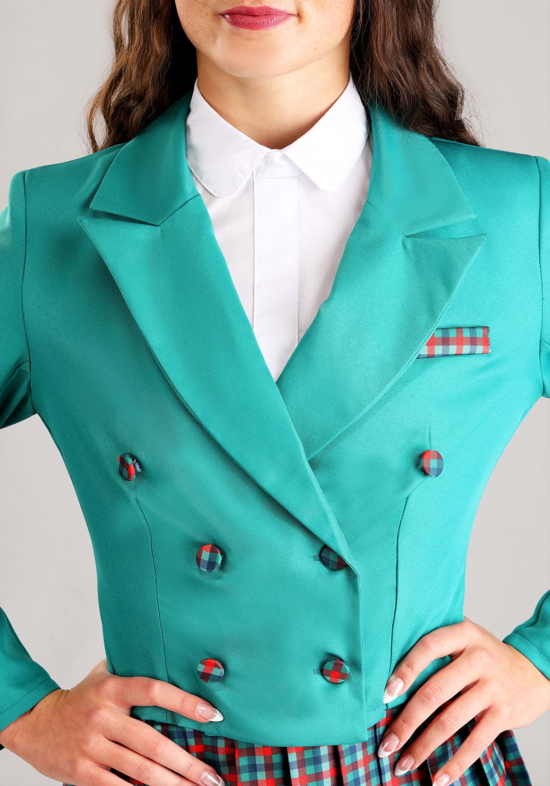 This costume includes a sharp turquoise cropped jacket that practically screams “I’m in charge now,” complete with plaid-covered buttons and a matching plaid pocket square for bonus attitude. The shirt front gives the illusion of prim and proper while you’re plotting absolute chaos underneath.