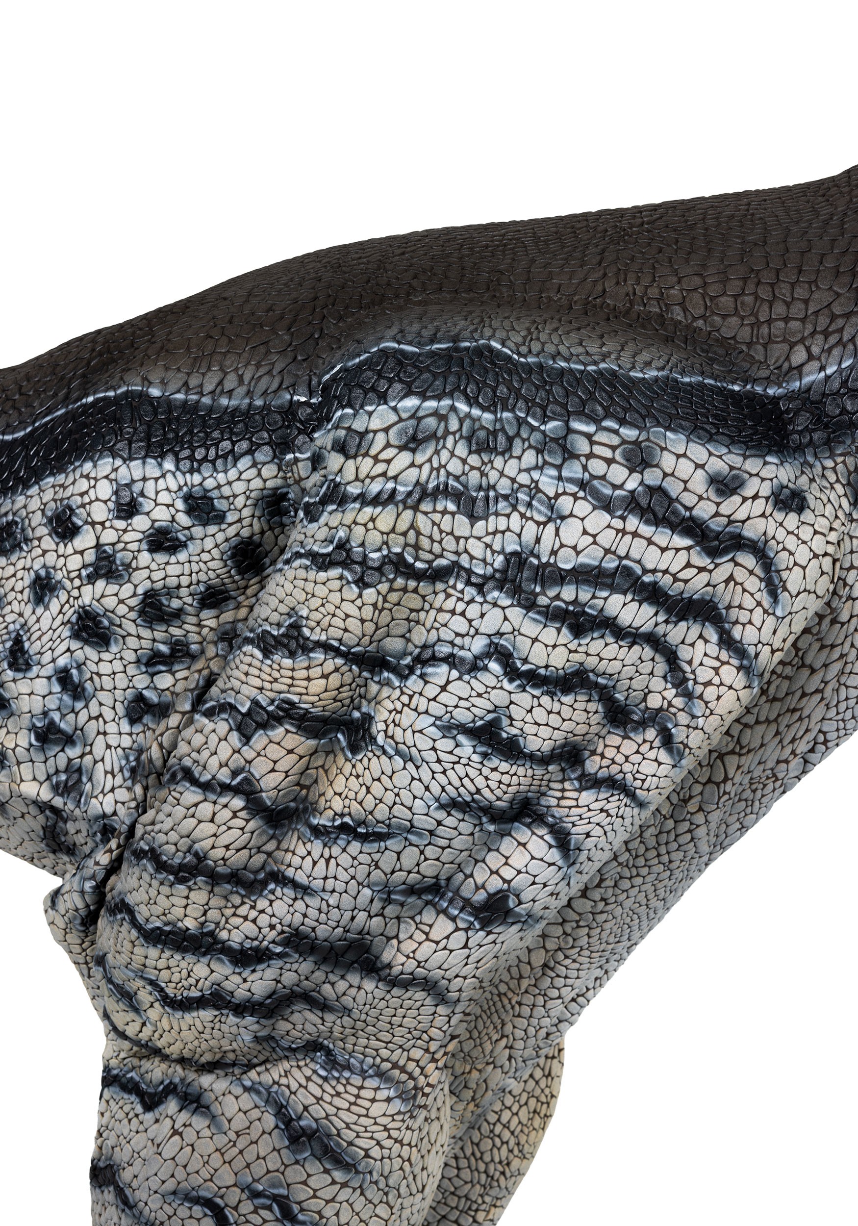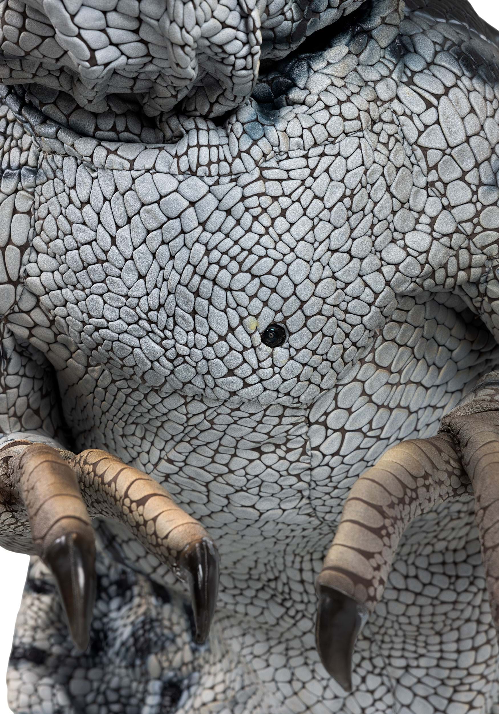 Standing 82 inches tall, this costume features a thick foam interior and a textured vinyl-like exterior for structure and realism... if any brave individual is willing to try to touch this living spectacle. The head includes thick plastic teeth, a foam tongue, and stretchy fabric interior cheeks, with blinking eyes that activate automatically. Vinyl foam talons cover the feet, while the claws are slightly posable.