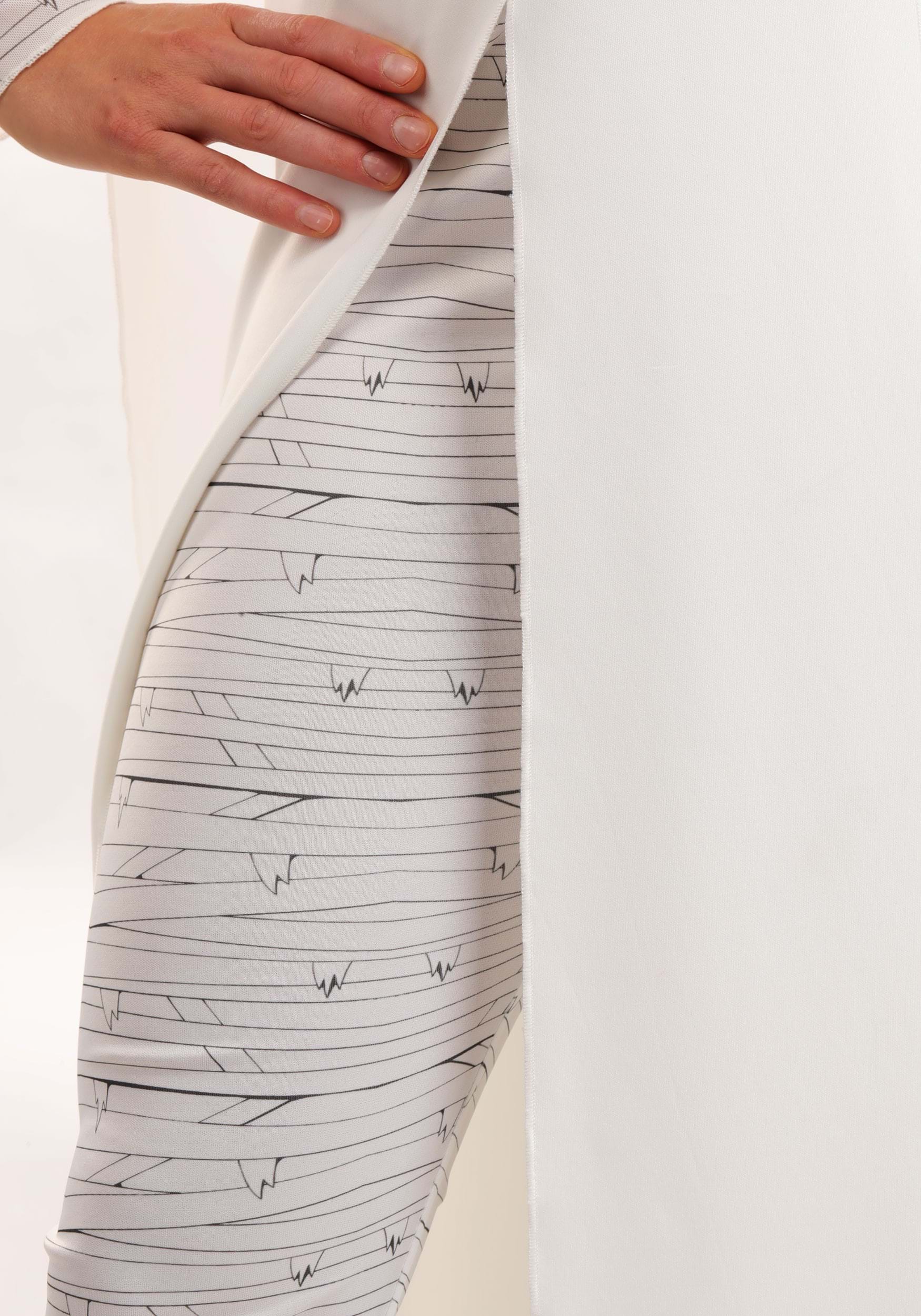 The costume includes a structured white dress made of matte satin with a dramatic chiffon overlay, creating an elegant, otherworldly silhouette. A built-in black lace waistband gives the dress definition at the waist while keeping it comfortable with stretch. The front of the skirt opens to reveal matching printed mesh leggings that resemble classic monster bandaging—but make it modern and stretchy enough for actual dancing (or light reanimation work).