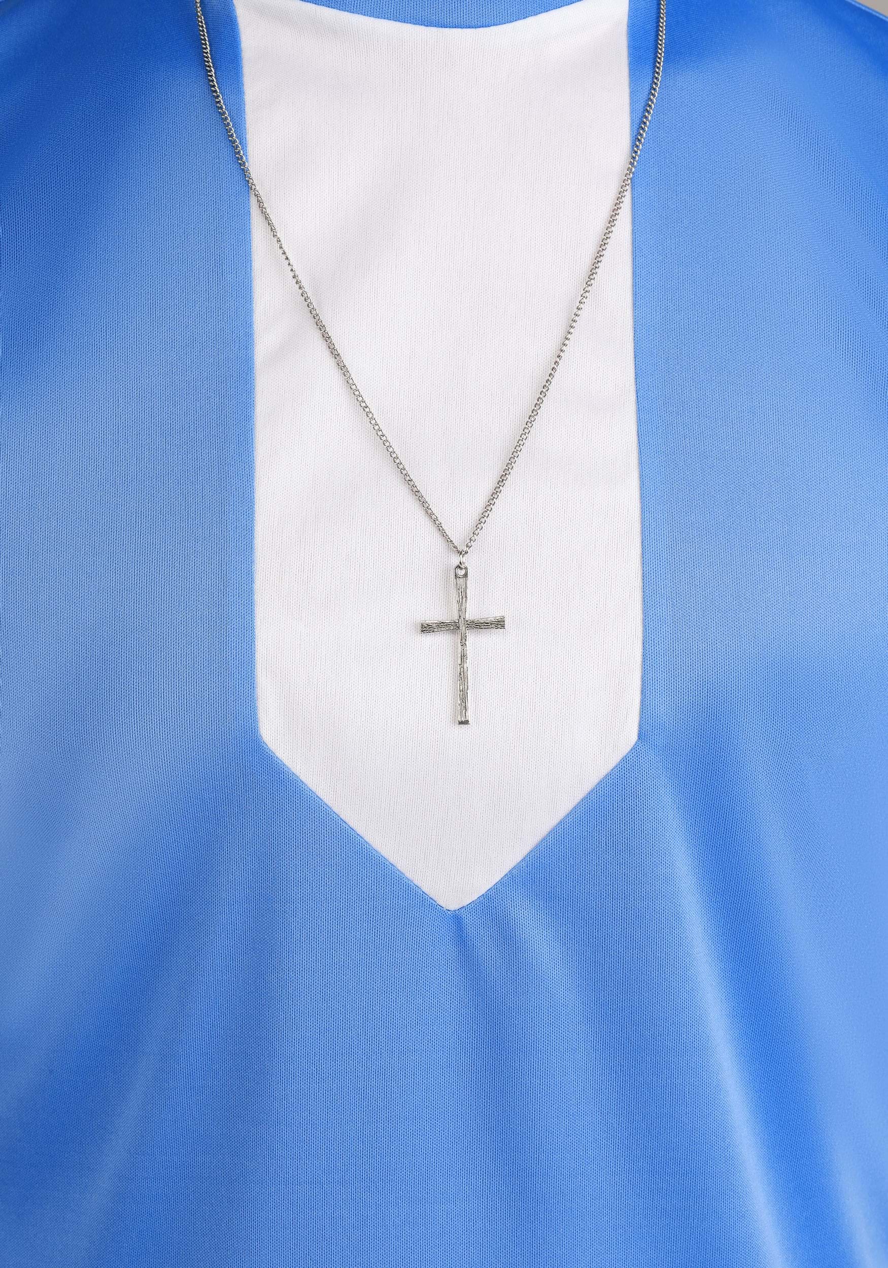 - Metallic silver cross necklace has lobster claw clasp