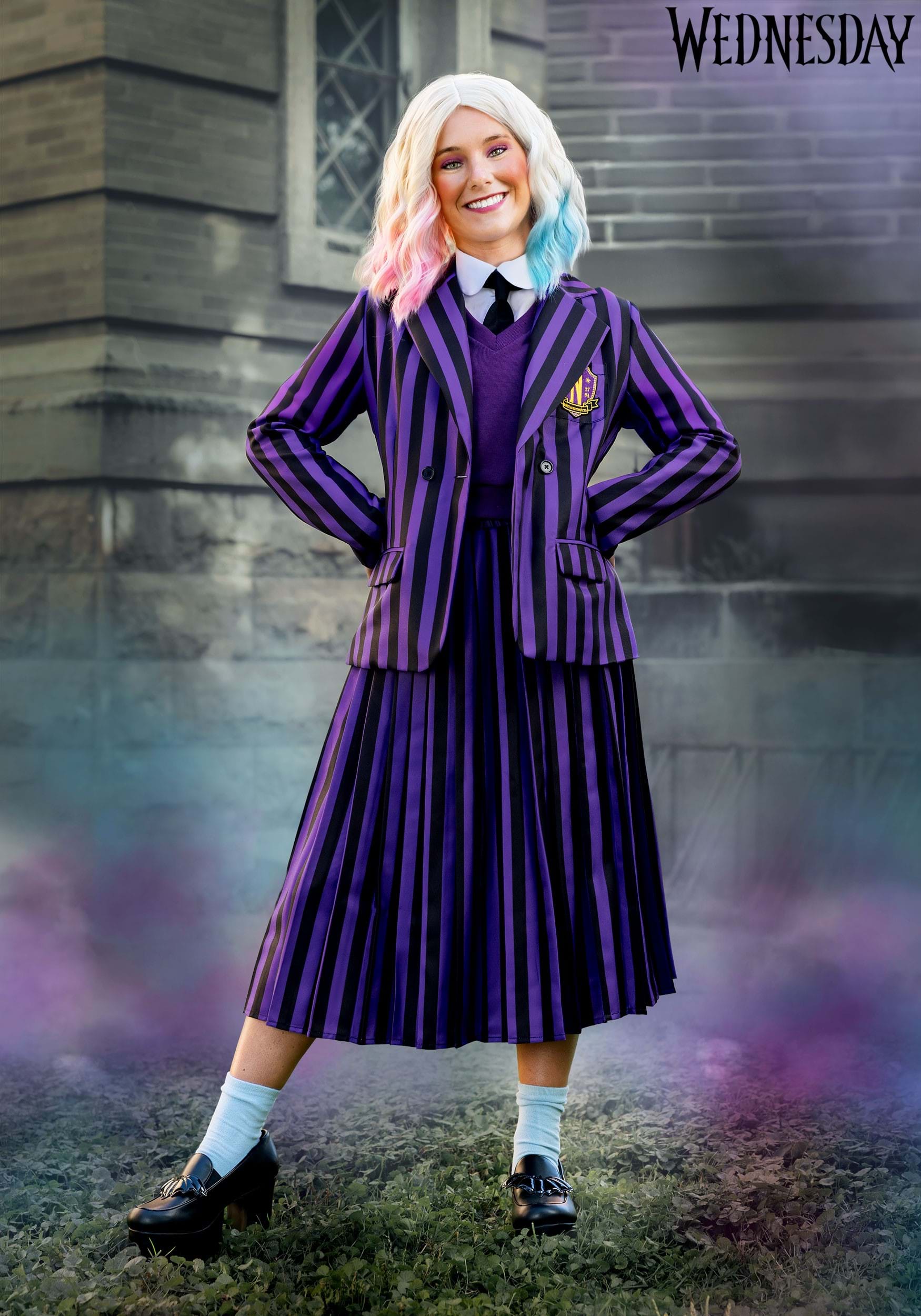 The pleated skirt matches the blazer with identical stripes, hitting mid-calf for a look that’s classic but still cool enough for social media selfies or thwarting ancient prophecies. Underneath, you’ll layer a white polyester broadcloth shirt and a cozy knit vest in Enid’s signature violet hue. A black tie ties it all together—because nothing says “don’t mess with me” like a well-coordinated outfit.