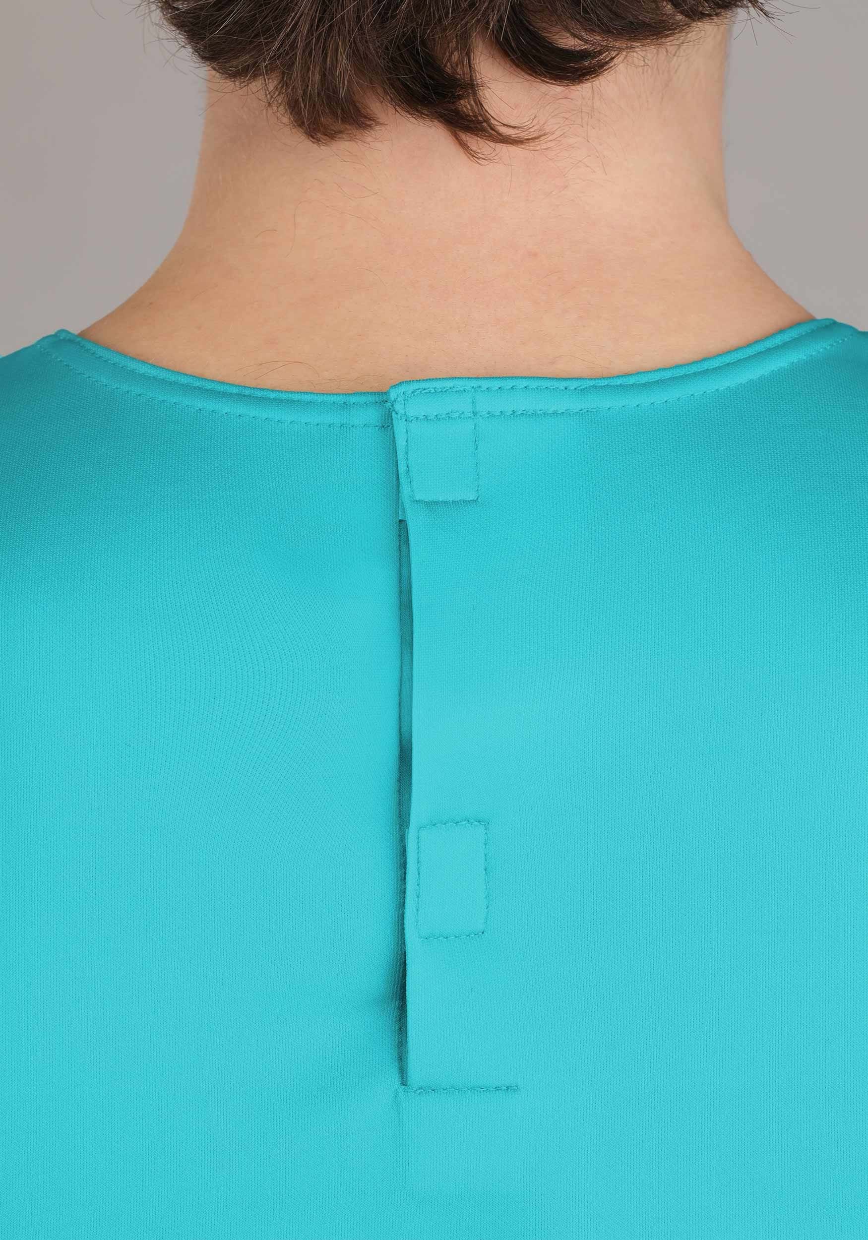 - Printed scuba knit shirt has jersey knit striped chest and sleeves, hook and loop fastener on the back