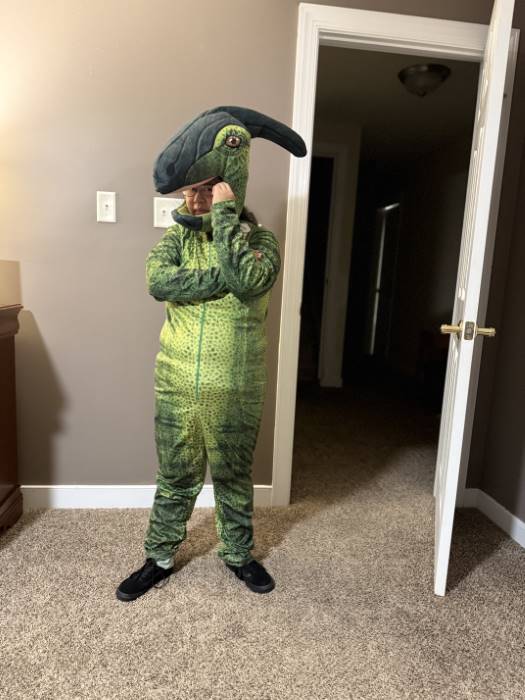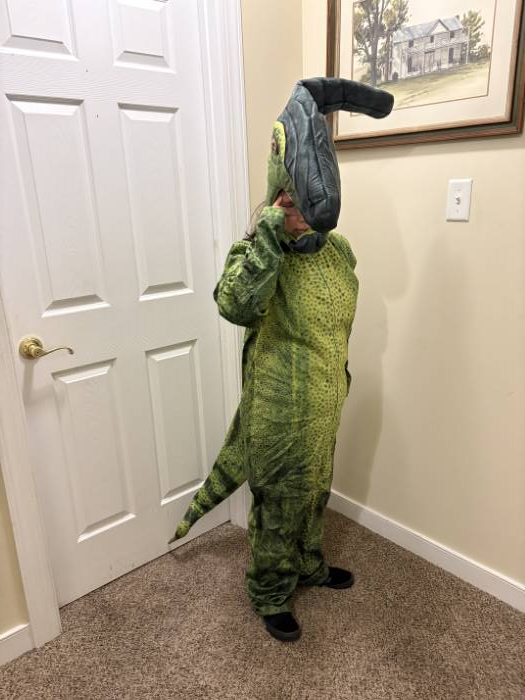 This costume is ready to wow as soon as it arrives at your door. From the beautifully sculpted hood to the printed shoe covers. The only thing we can't help you with? Pronouncing the Parasaurolophus's name!