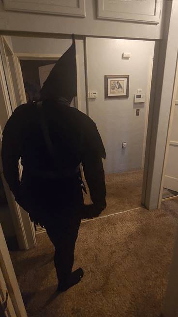 A tall, pointed hat made from structured felt and velvet sits neatly on top, holding its classic shape. The faux leather belt adds definition across the chest, complete with metal buckles for an adjustable fit. Every piece works together to create a smooth, shadow-like finish that stands out—without needing color to do it.