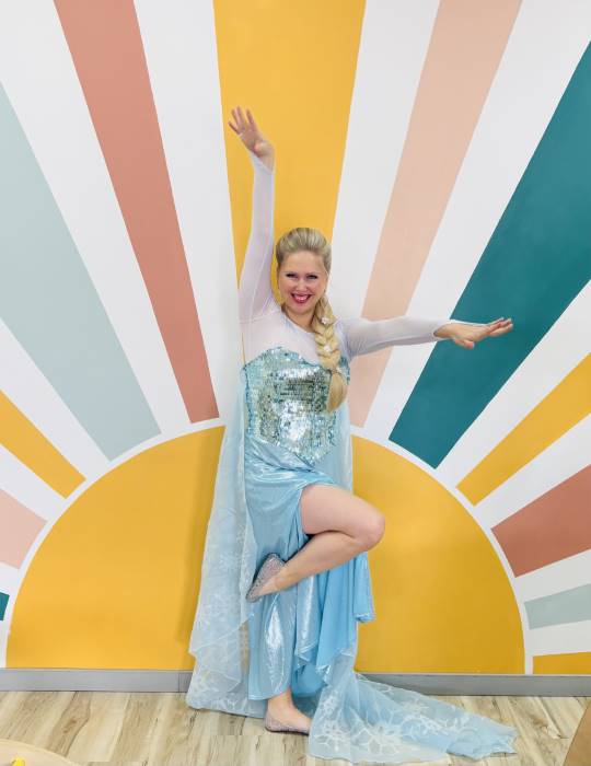 Designed by our own Made By Us team, this ensemble boasts a stunning blue corset, accompanied by a sheer cape that elegantly attaches to the inside of the corset. Additionally, the look encompasses a graceful, flowing blue skirt adorned with glittering snowflake prints, perfectly complemented by a charming mesh top.