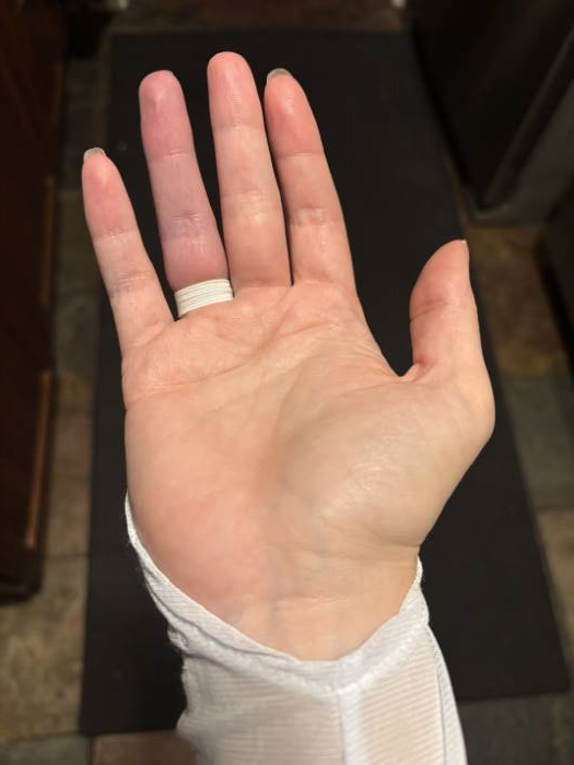 4) The finger loops to the sleeves are so tight on my dress and I have thin fingers (size 6). After a minute of wearing them, the circulation was being cut off my ring fingers (see picture below). So I tried to stretch them out by placing hair rollers in them for days before the party. They were still very tight so I put the loops on my pinkies, but still have to take a few breaks during the party to give my fingers circulation.