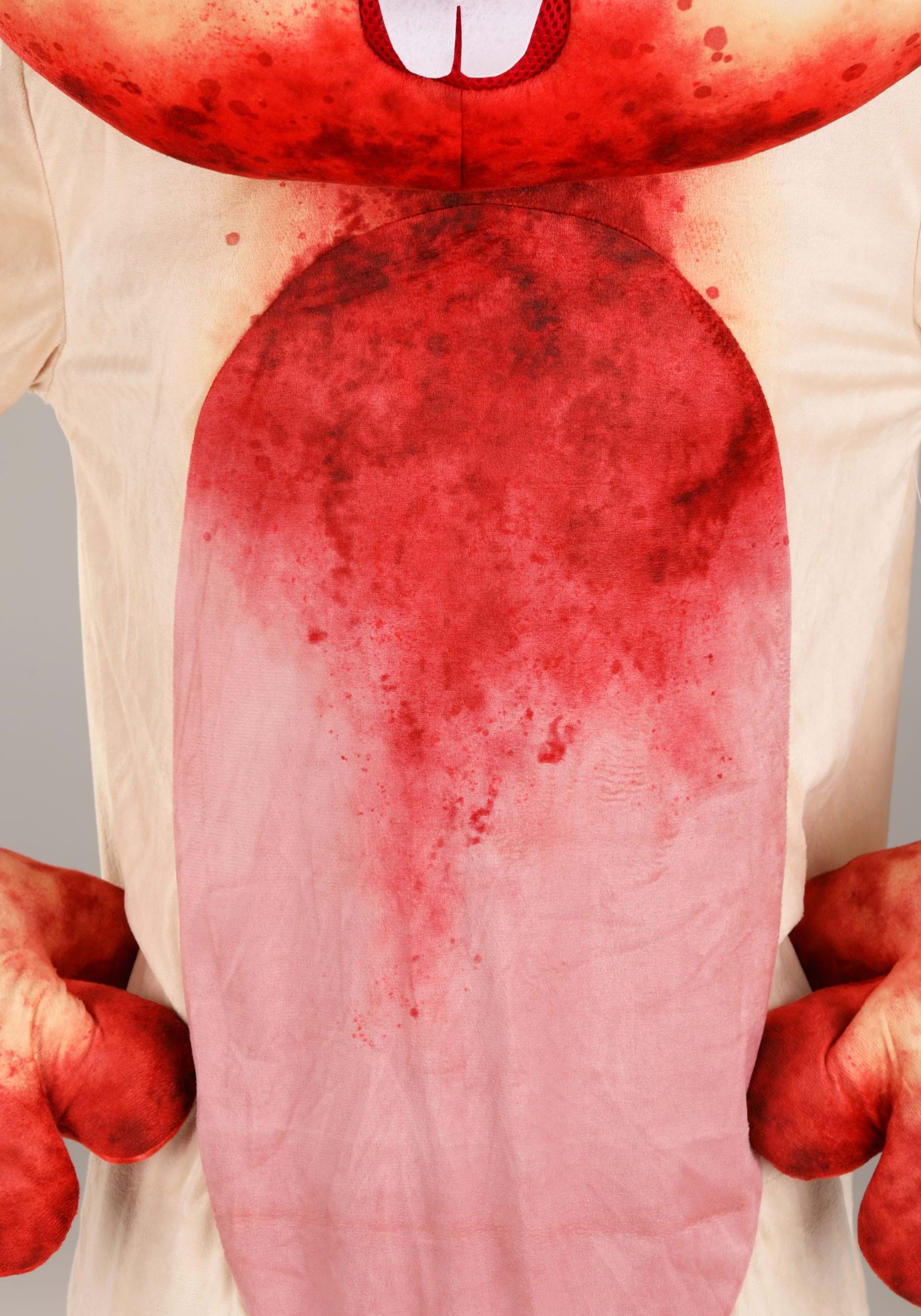 Crafted from 100% polyester velour fabric, this jumpsuit is a fusion of terror and comfort. It features a back zipper, ensuring ease of slipping into this nightmarish persona. The paw-shaped mitts, sewn to the sleeve cuffs, can flip back, freeing your hands for eerie gestures. A stuffed tail is sewn to the back of the suit, completing the bunny silhouette. But it's the printed blood stains that transform this from a mere costume into a chilling spectacle, hinting at a sinister backstory.