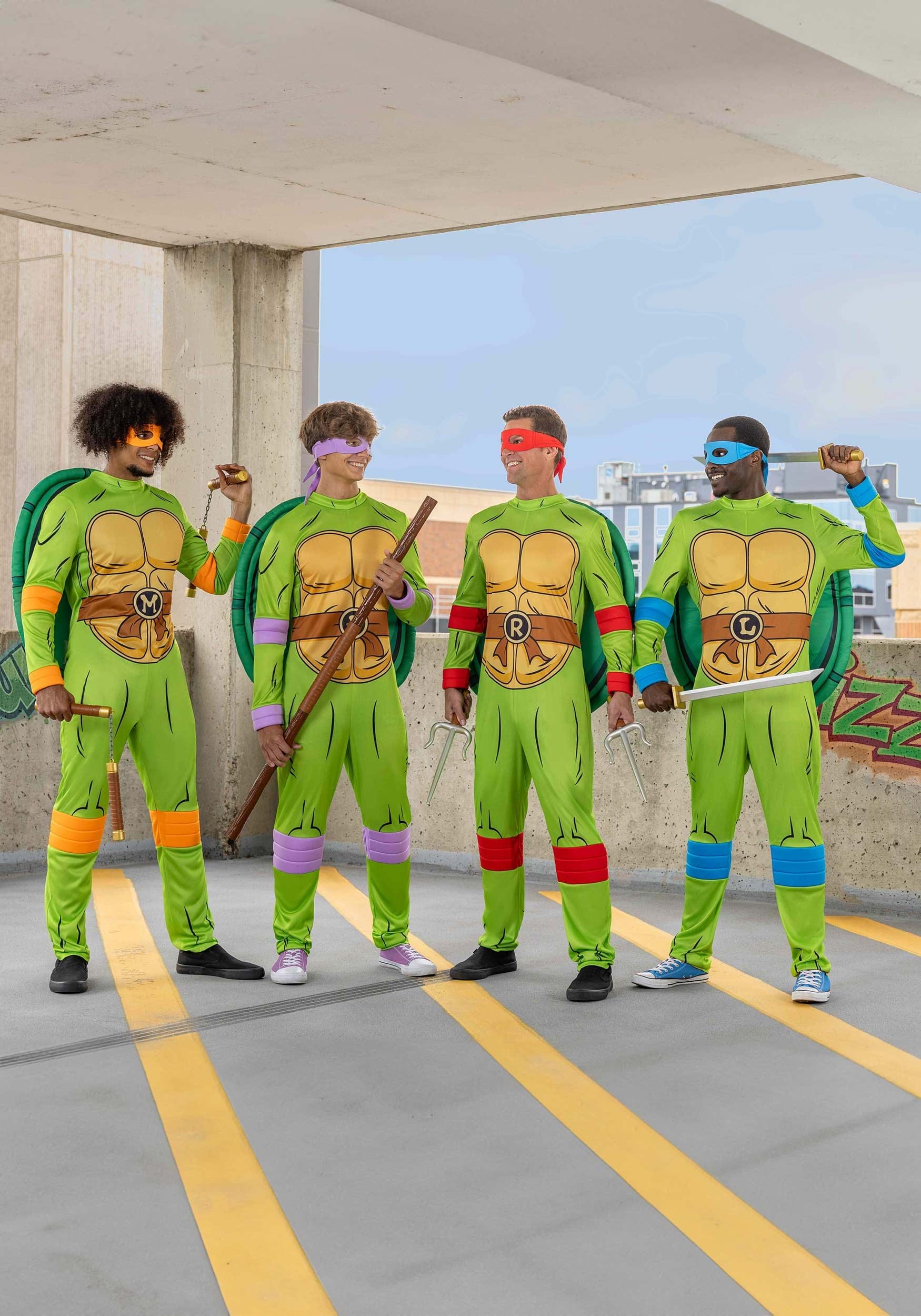 The suit is printed with Mikey’s iconic turtle torso, orange elbow and knee wraps, and his signature belt—complete with a big "M" on the front to remind everyone which party dude you are. The attached hood has his orange bandana, printed eyes, and even little side ties, so your head is in full ninja turtle mode the second you pop it up.