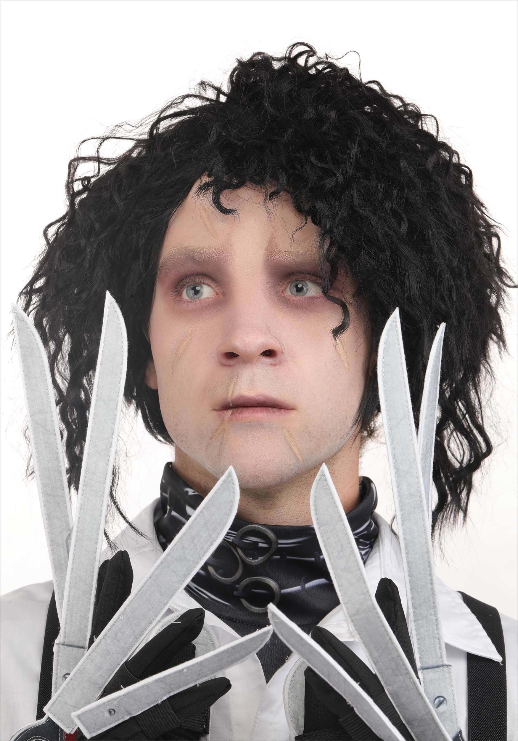 No Edward look is complete without his hands, of course. Wrist-length jersey gloves slide on comfortably, and each stiffened felt scissor blade has an elastic loop at the base to fit snugly over your fingertips. You'll look ready to shape a hedge, but thankfully, your fingers will stay intact. Top it all off with the synthetic wig styled in Edward's signature wild, gravity-defying 'do, and you've got yourself a look that screams "lovable outsider" in the best way possible.