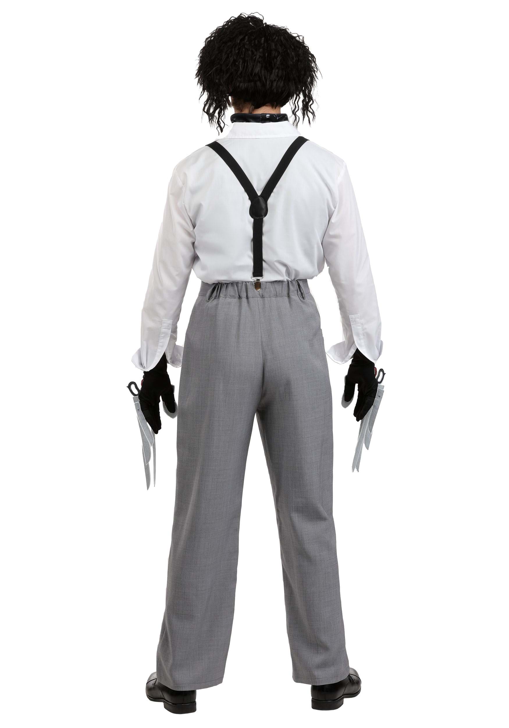 The grey heather pants fasten with a plastic button and have an elastic back, because even scissor-handed icons deserve comfort. And those suspenders? They're held together with safety pins, recreating Edward's perfectly imperfect, DIY style.