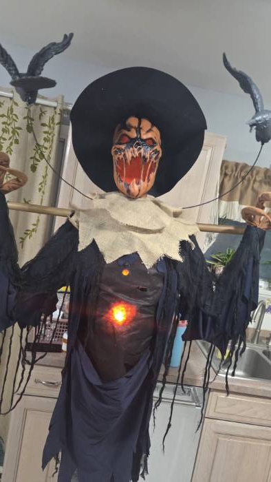Activated by sound or motion, it lets out haunting phrases, bursts into maniacal laughter, and even hisses like a demonic cat. As if that weren't terrifying enough, the three black crows circling its head spin menacingly, as if caught in an unholy ritual. Whether lurking in a foggy graveyard scene or standing watch over your porch, this sinister figure ensures your Halloween haunt will be one of the best in the neighborhood!