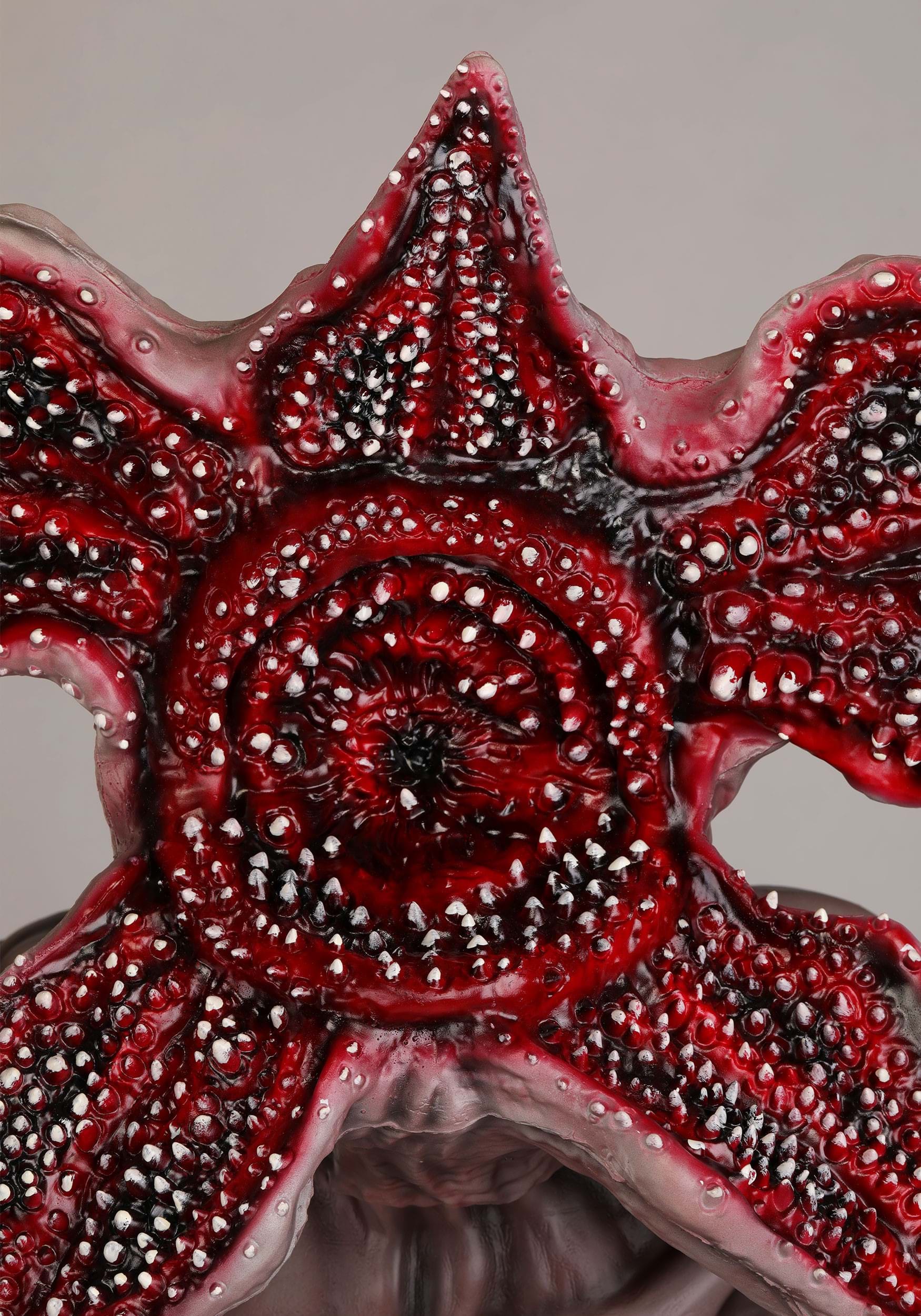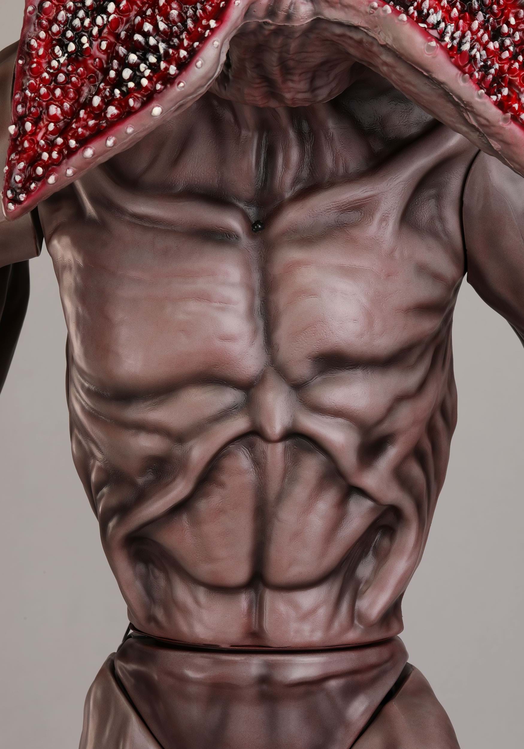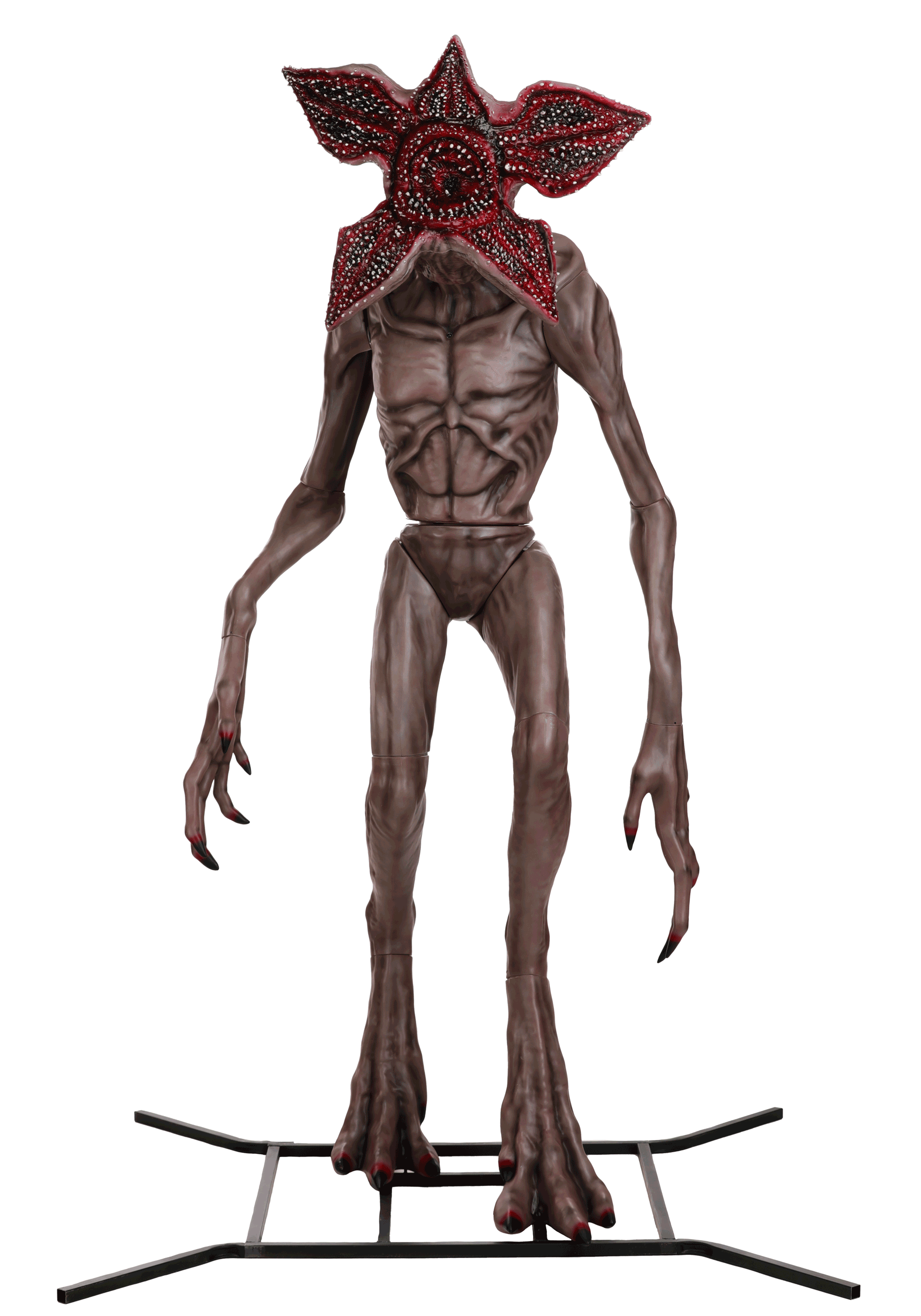Standing at a monstrous height, this animatronic Demogorgon features a metal support frame, detailed plastic limbs, and polyester fabric accents for a horrifyingly lifelike finish. The head and chest are sculpted to match the onscreen look, complete with that open-flower face and deeply unfortunate skin tone. It moves side to side at the waist and emits unsettling Stranger Things sound effects, with volume control included for adjusting from "eerie ambiance" to "just plain nope!"