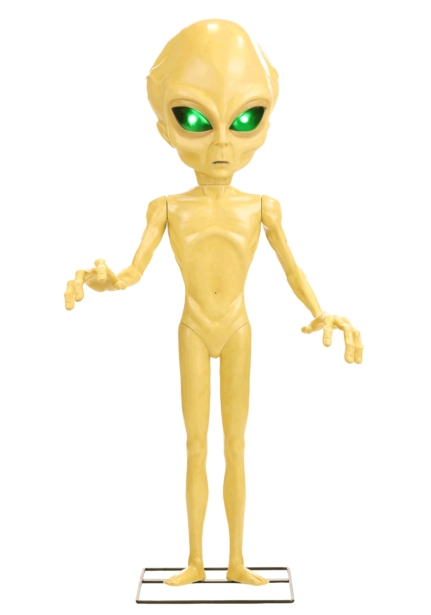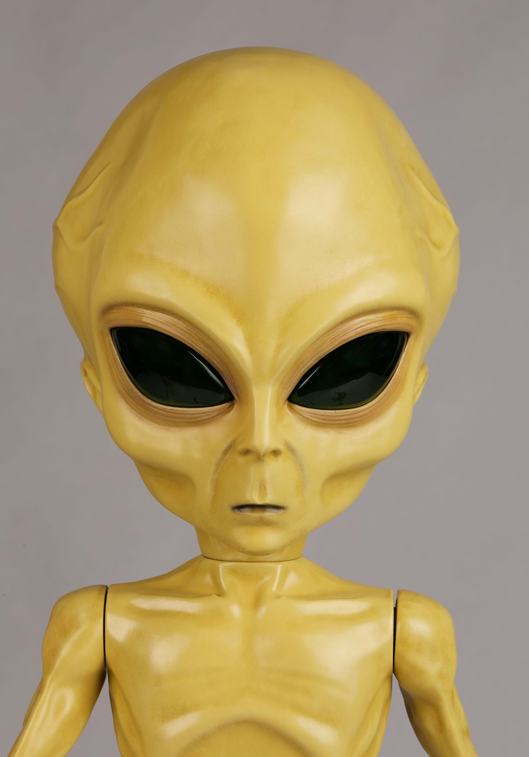 Standing 4 feet 6 inches tall, this exclusive alien animatronic features a plastic body on a metal stand, with otherworldly proportions—tiny torso, gangly limbs, and a comically oversized head that gently swivels from side to side. His giant green eyes light up with an eerie glow while he spouts alien gibberish, clicks, and spacey robotic sounds that scream “we’ve made contact, and it’s weird.”