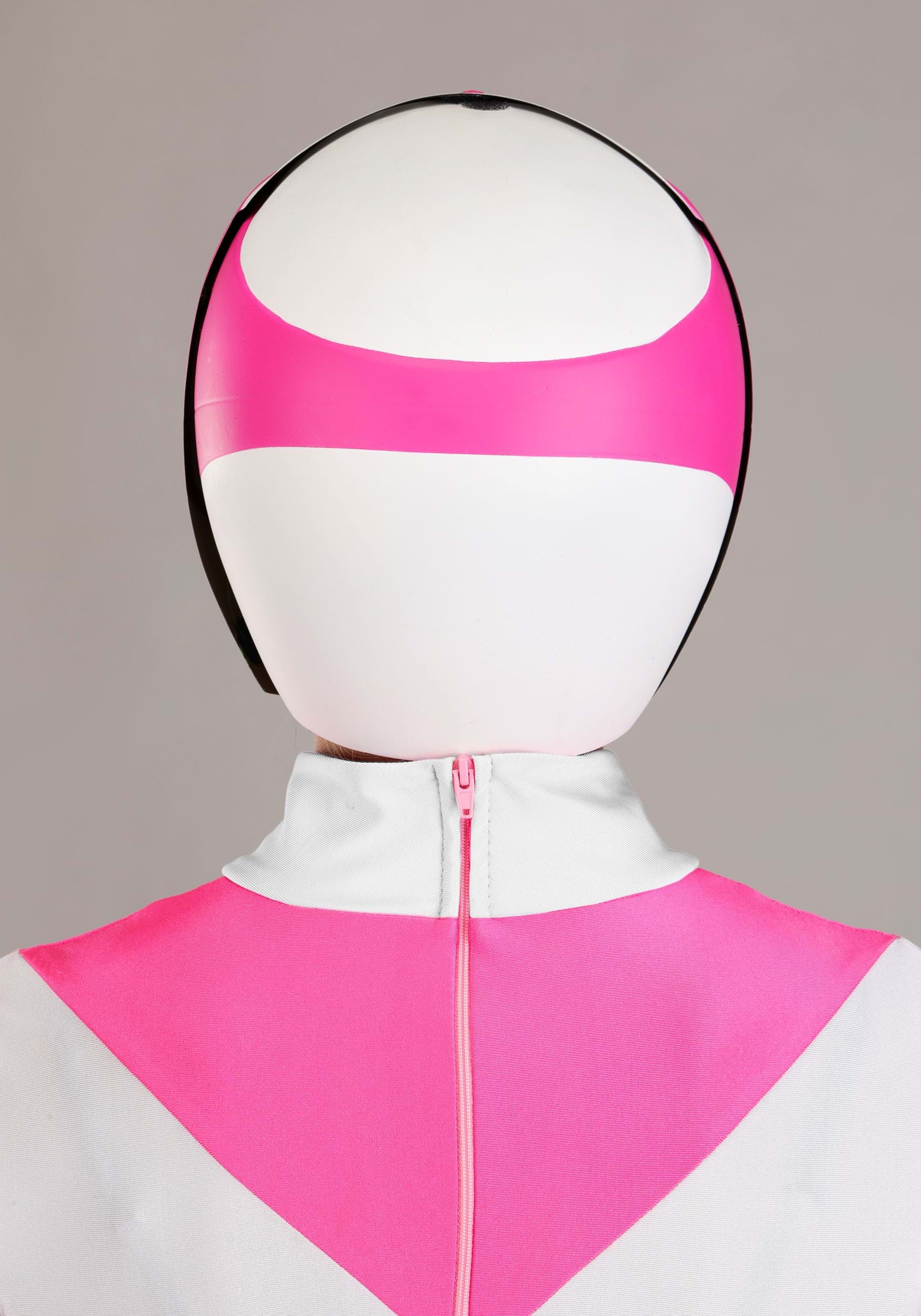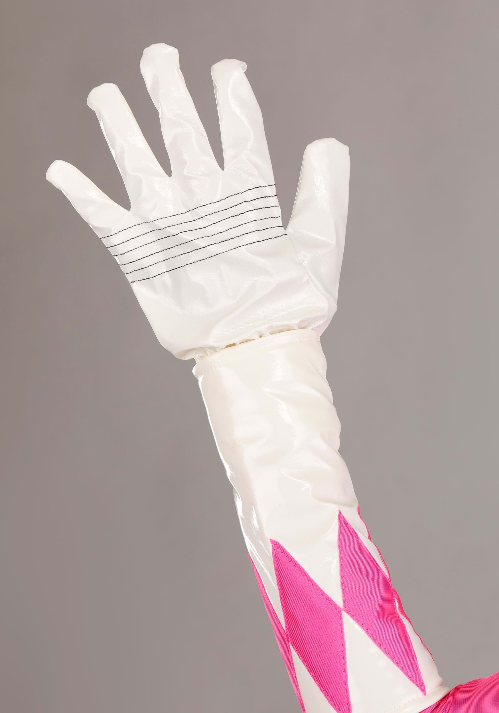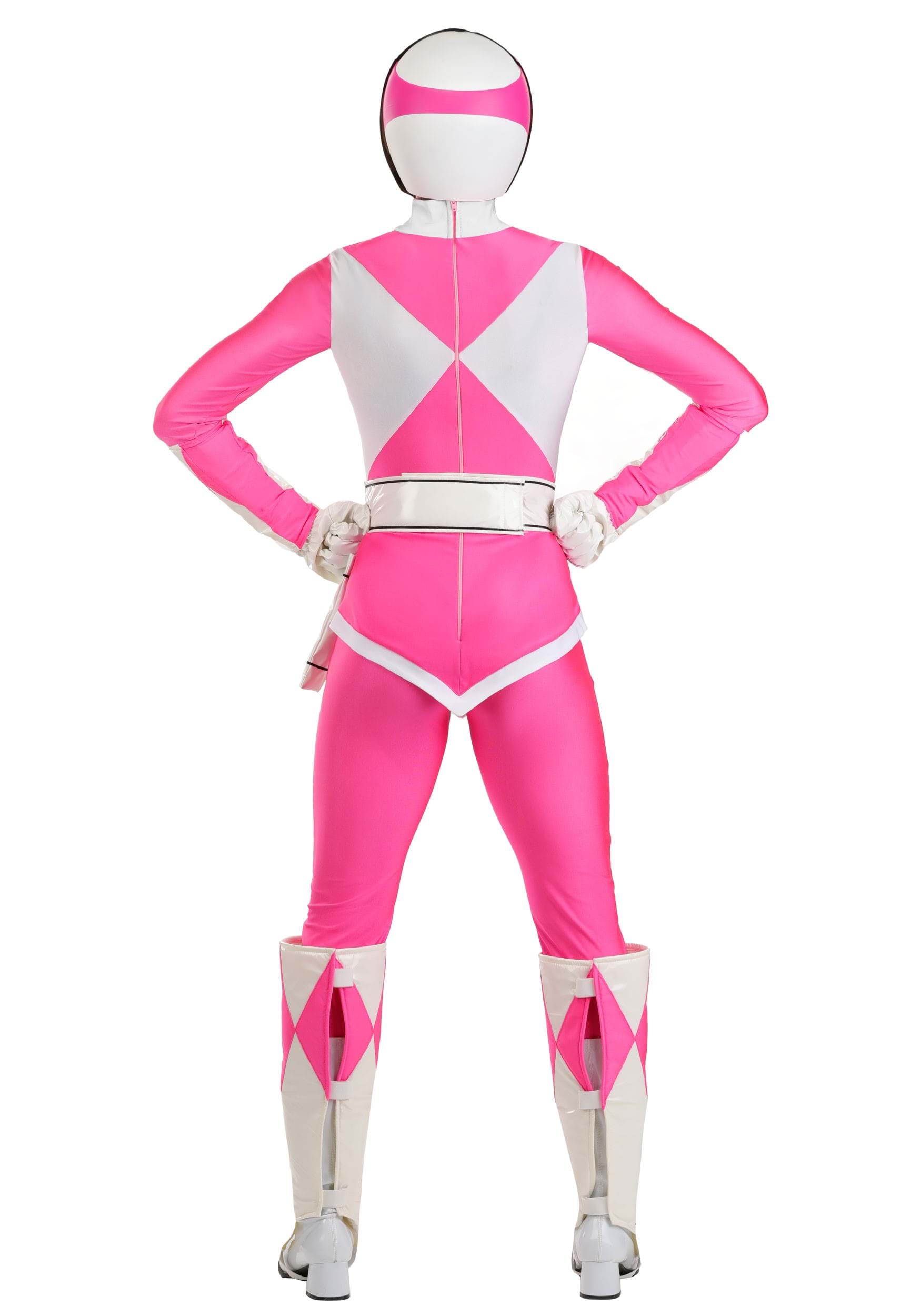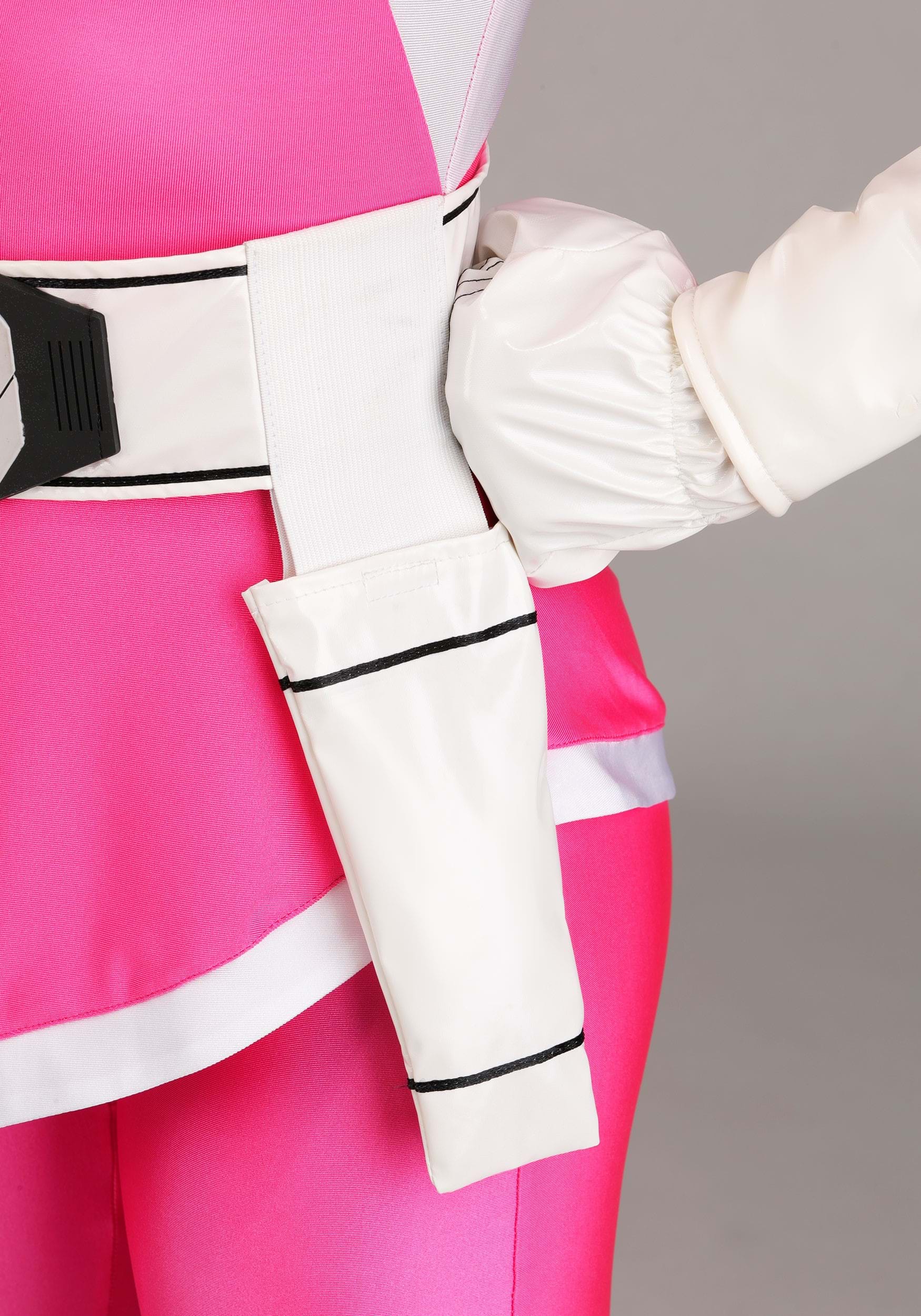 The jumpsuit, spats, and wrist guards are made from 4-way stretch spandex with a shiny finish that mirrors the look from the original series. The pink-and-white diamond pattern stays true to the on-screen design, and the back zipper keeps the fit smooth. A foam-backed belt adds structure and features the Pink Ranger’s Morphin Badge with the iconic Pterodactyl emblem.