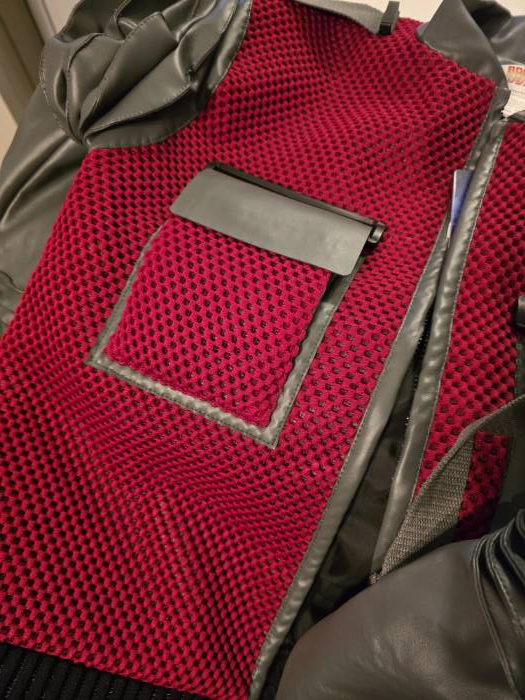 - Red jacket body is a unique "waffle" style fabric, zipper on front