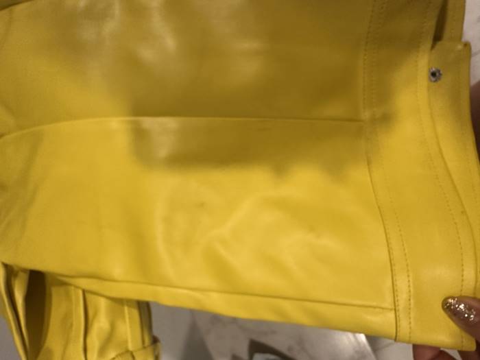 This Beatrix Kiddo motorcycle suit comes licensed from Quentin Tarantino's Kill Bill. The costume includes a yellow jacket with matching pants, inspired by the outfit worn by Uma Thurman in the film. The jacket has a zip-up front, along with buttons along the neck and waist. Each sleeve has black stretch fabric to allow a form fitting style, while pads in the front create a true motorcycle jacket look.