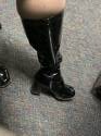 Go-go boots came into popularity with the new streamlined looks of the mid to late sixties and didn't go out of fashion until the late seventies. Since then they've faded in and out of the eye of the public. These boots have a modest flared heel that will keep you stable on the dance floor while still giving you a lift. They are made of a wet look fabric and will look fabulous with short disco dresses.
