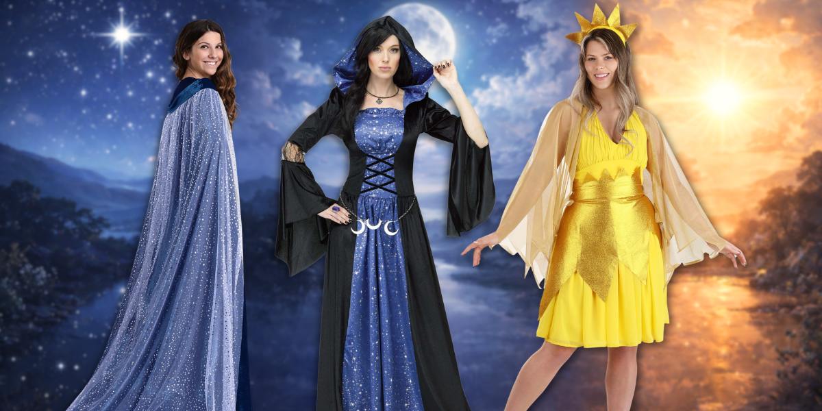 For character costumes, channel bright and sparkling outfits to bring The Star to life, letting you shine with reflective fabrics and light-catching details. You'll find The Moon represented in all sorts of witch, sorceress, and nature characters. (Not to mention everyone's favorite young hero, Sailor Moon.) The Sun brings warmth and energy with radiant designs, warm colors, and flowing fabrics.