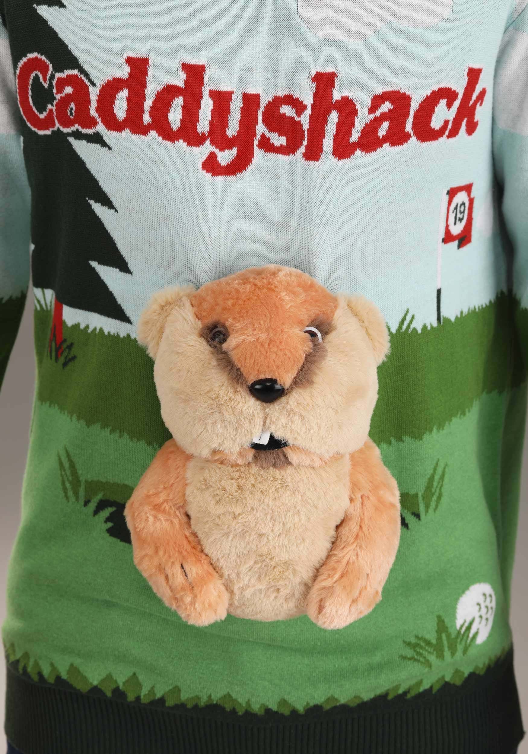 Win the sports apparel game for all time when you sport this Adult Caddyshack Ugly Sweater. This cotton-blend sweater has rib-knit bands on the neck, waist, and cuffs for supreme comfort. It has all-over print to bring the essence of the game wherever you go. And it also has snaps on the front to attach a plush stuffed animal companion in the form of the fan-favorite gopher, Caddyshack, himself! Who doesn't want to cuddle a buddy while being cozy themselves!?