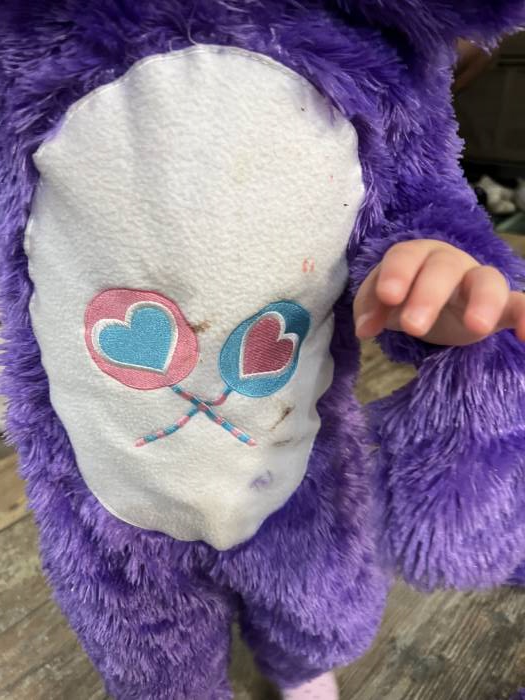 Turn your child into the most generous Care Bear of them all, Share Bear! This toddler sized costume is a Made By Us design inspired by our adult versions of the costume. The costume comes with a soft, purple jumpsuit covered in faux fur material. It fits with a zipper in the back, and even comes with the character's signature belly badge in the front.