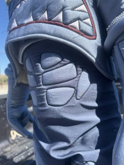 - Quilted foam chest armor closes w/ hook & loop fastener at right shoulder & side seam