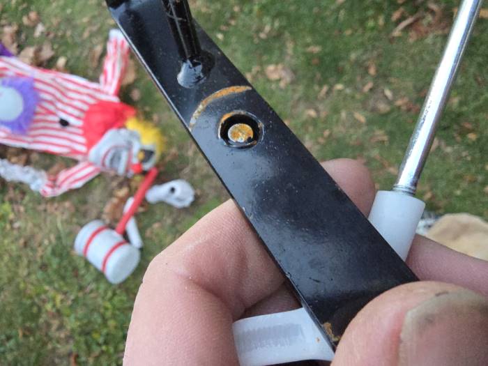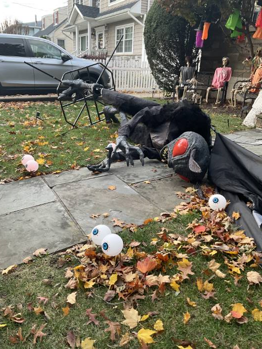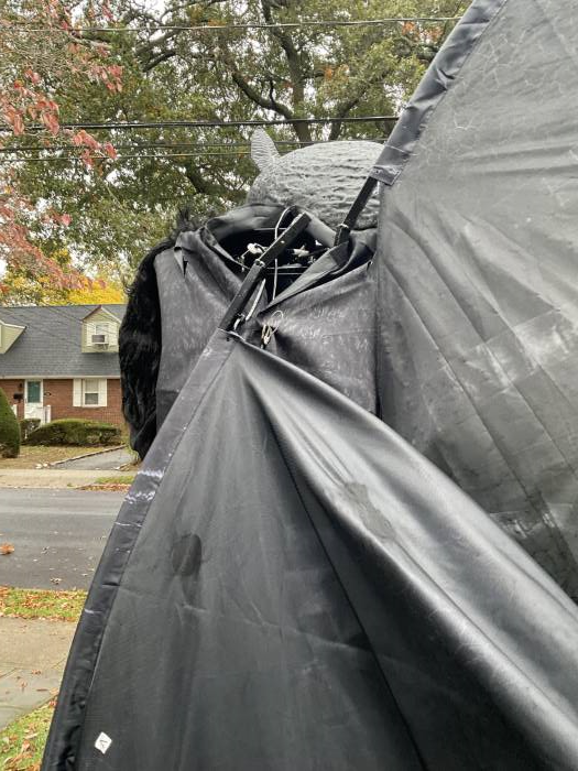 This breaks my heart because when I initially assembled this and got it up on the lawn, it was magnificent! But there was a problem right from the start. Part A and Part B weren’t lined up and we had to get the guys at the gas station to hammer it in. We got past that and the rest of the assembly went smoothly. My Mothman ruled the neighborhood . . . for all of 10 days! He didn’t even make it until Halloween. First, the wing snapped off. Then it fell over and one of the extra rods at bottom broke in half.