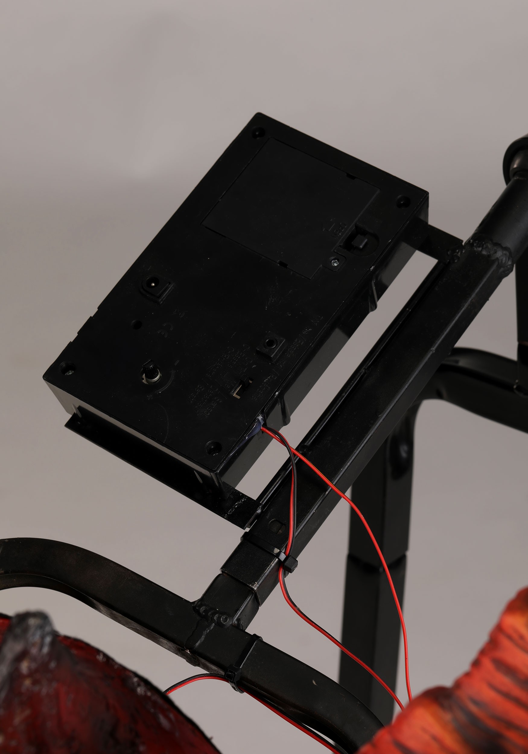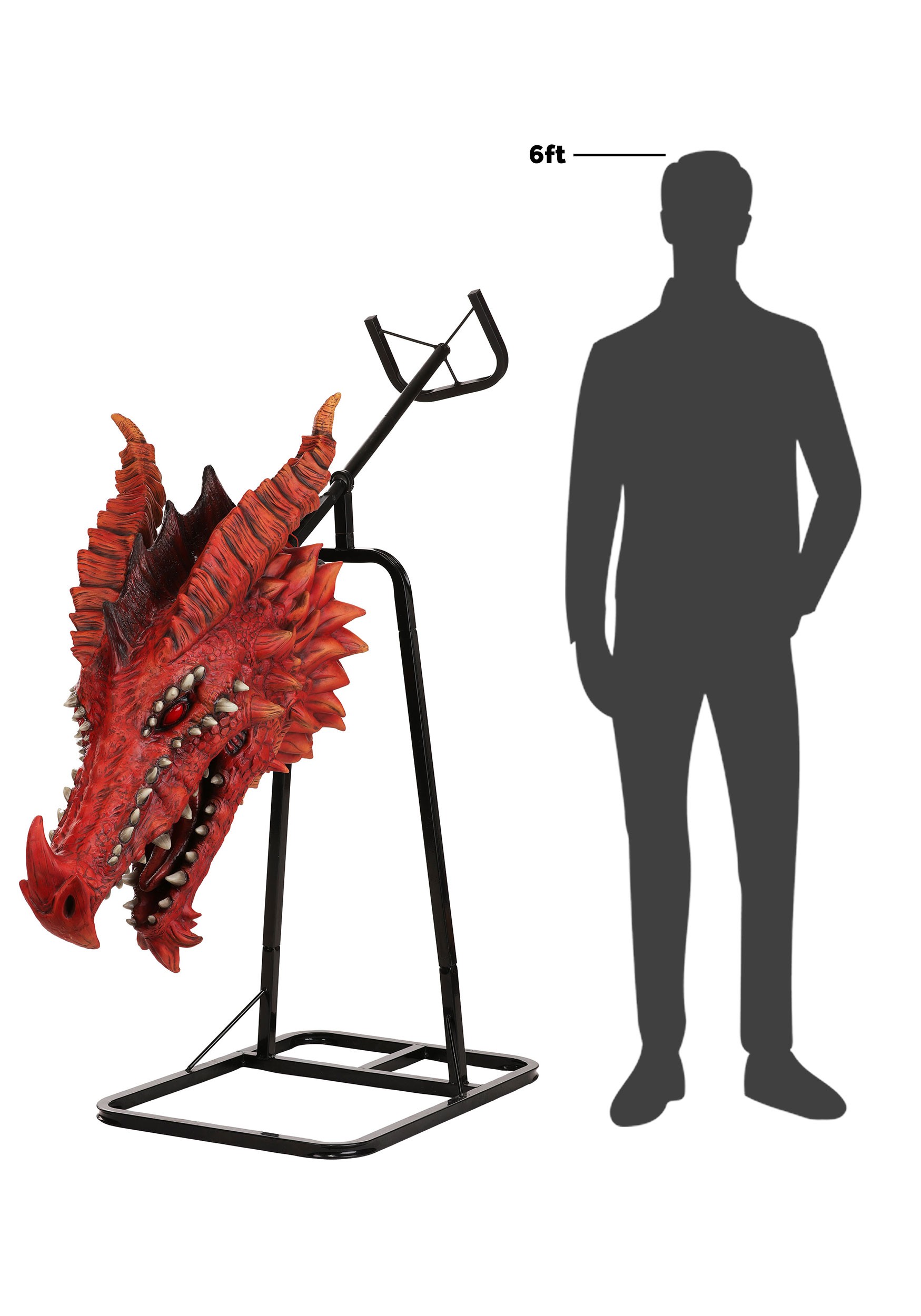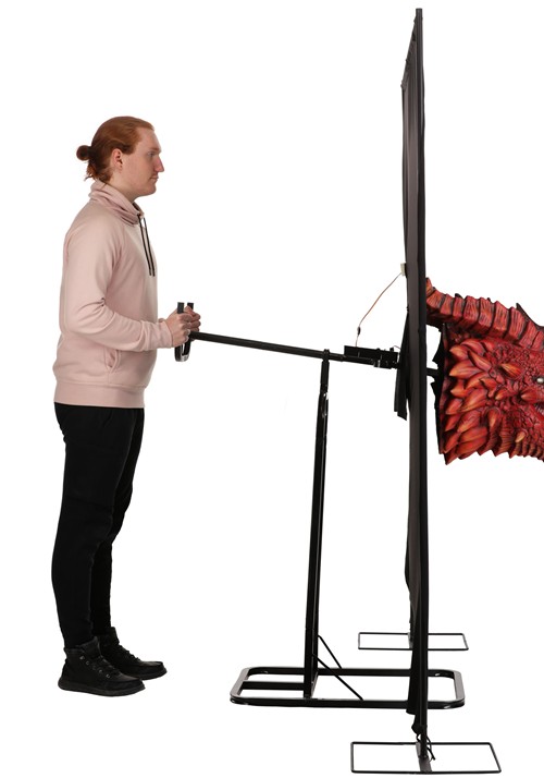The whole setup is supported by a solid metal frame that fits neatly behind the included black fabric backdrop and curtain stand for a seamless display. Thanks to a lever system with hand grips, you can make the dragon's head move—(because a stationary dragon is just a fancy gargoyle). It's powered by a standard US outlet or optional battery ports, so whether you're going all-out or keeping it mobile, you're covered.