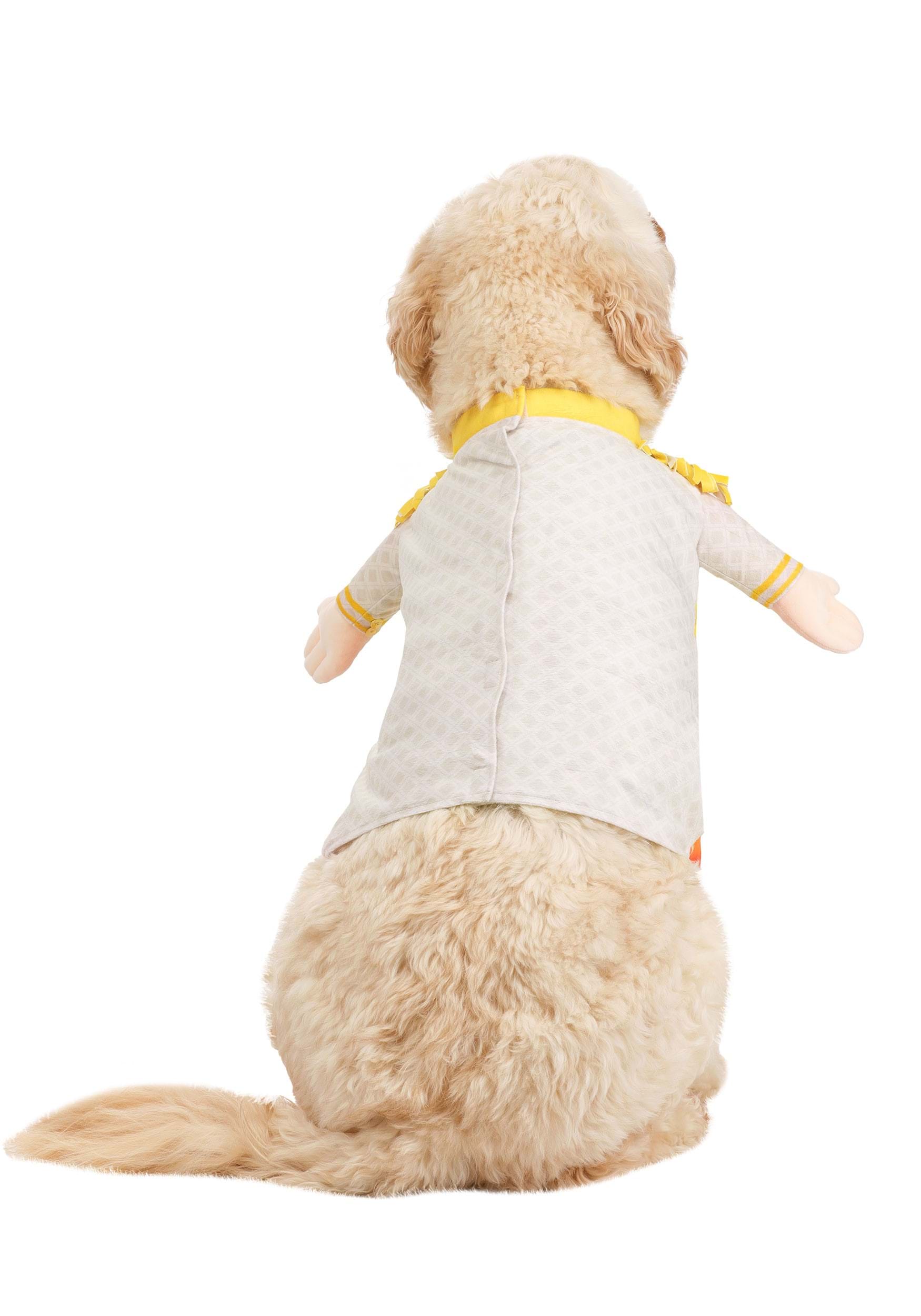 This Made By Us dog outfit is made with super-soft Minky fleece and easy hook-and-loop fasteners down the back to ensure your pup is comfy dressed as the prince. Printed, appliqued, and embroidered detailing gives the one-piece outfit a dynamic look to match Prince Charming's formal jacket and pant combo. Last, a pair of fiber-filled arm features one hand holding a felt-shaped glass slipper!