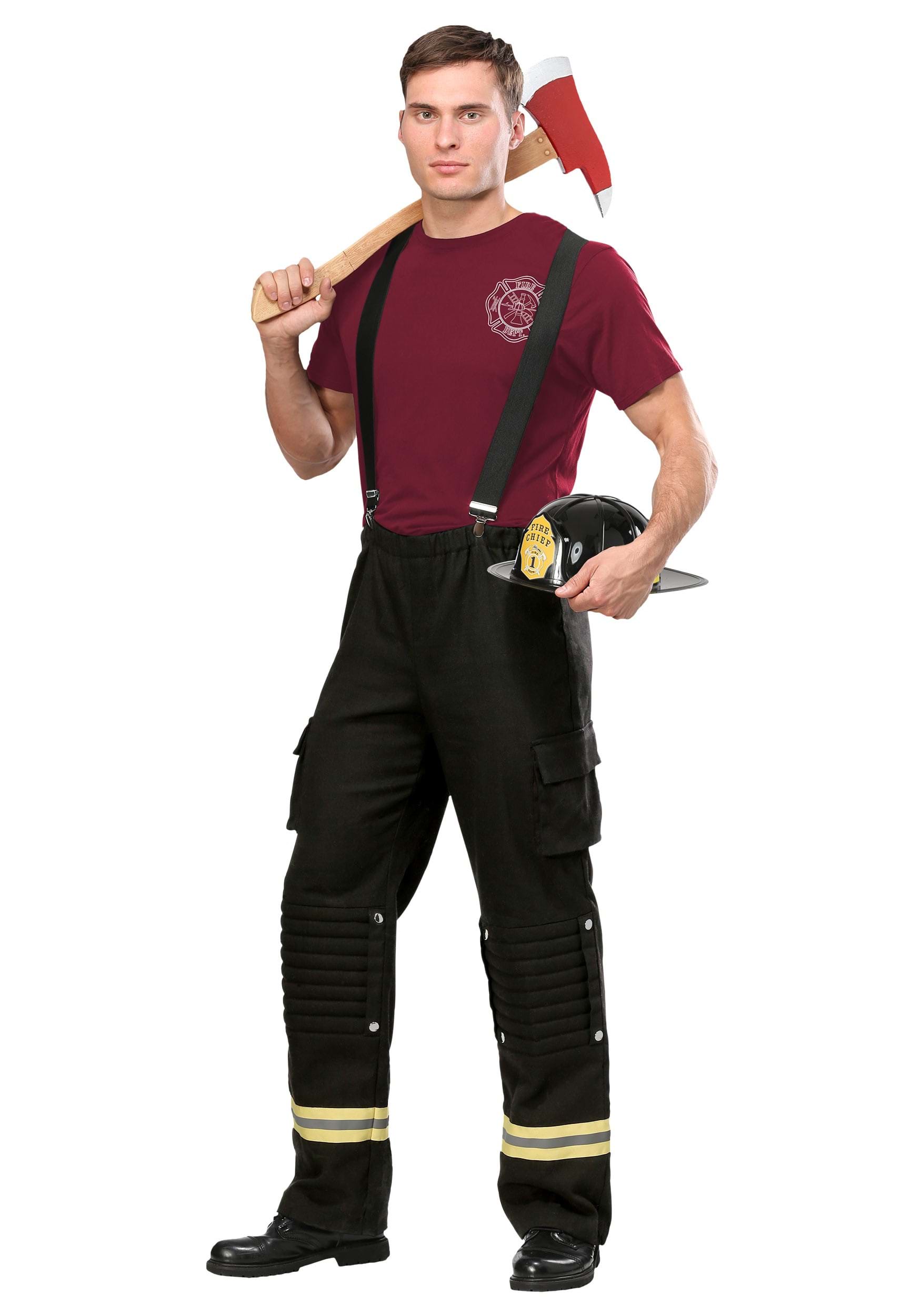 You'll feel like an official hero in this brave ensemble that's made by us right here at HalloweenCostumes.com. Though, we will admit, you'll have to go through some training before you get fire pole access! The black pants with Hi-Vis stripes on the bottom would fit right in when riding on a fire engine. Layer the official looking printed t-shirt under the black suspenders and top the ensemble off with the included cap and you'll be ready for anything. That is, if that anything is made up of a "hot to trot" costume party!