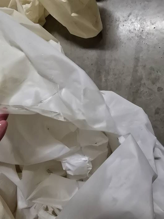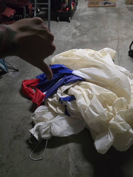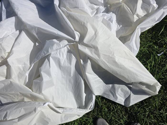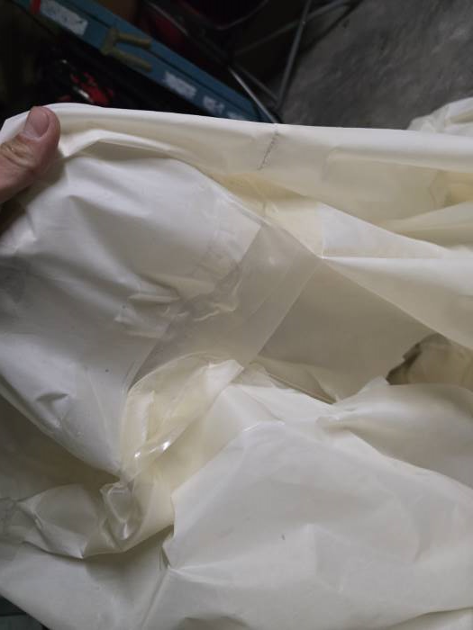 I love this guy! He is big! He brings cheer to all that see him! However, the one I got sections started yellowing. It is not spotting like a liquid splashed on it. It is sewn sections like the back panel and the curved sections on his rolls, as if different types of fabric were used.